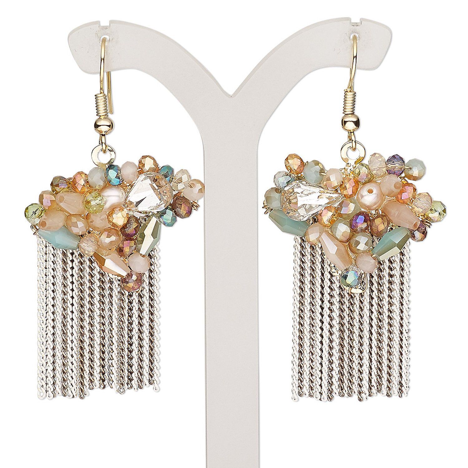 Earring, cultured freshwater pearl (bleached) / glass / gold-finished brass / steel, multicolored, 2 inches with fishhook ear wire. Sold per pair.