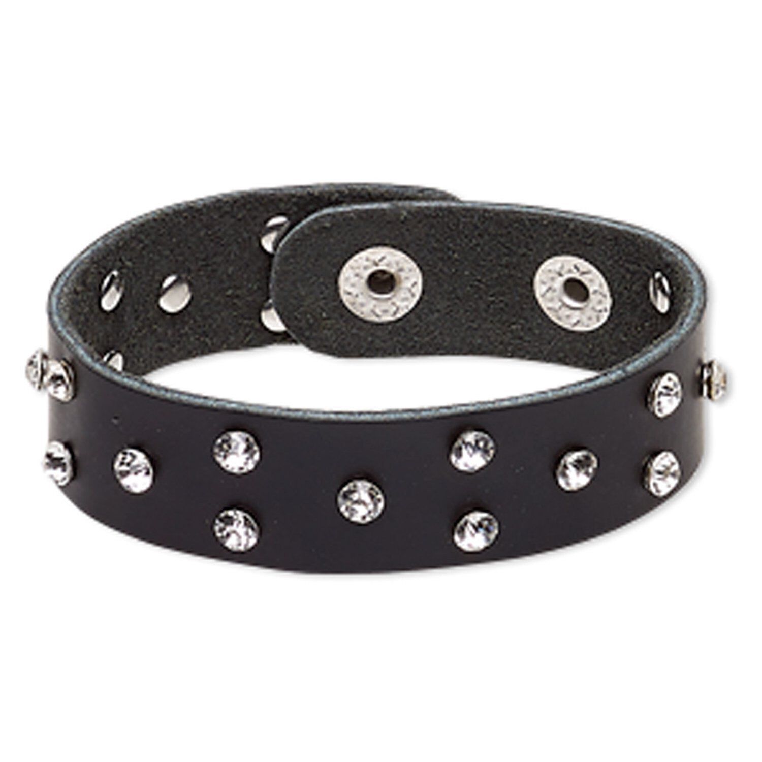 Bracelet, leather (dyed) / glass rhinestone / imitation rhodium-plated steel, black and clear, 20mm wide, adjustable at 6 and 7 inches with snap closure. Sold individually.