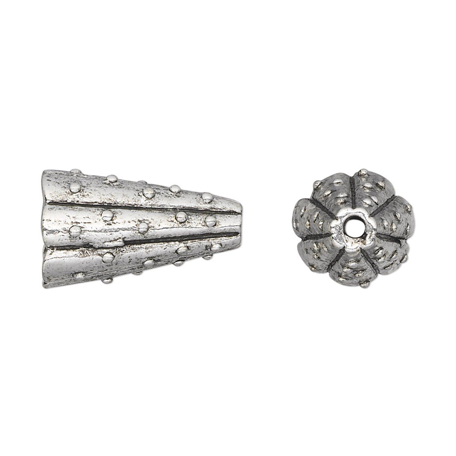 Cone beads have versatile design possibilities--they bring multiple strands together neatly, give beads a new look as bead caps and make a decorative tip for handmade fringe. The pewter (tin-based alloy) has an antique plating and an incredibly detailed style.