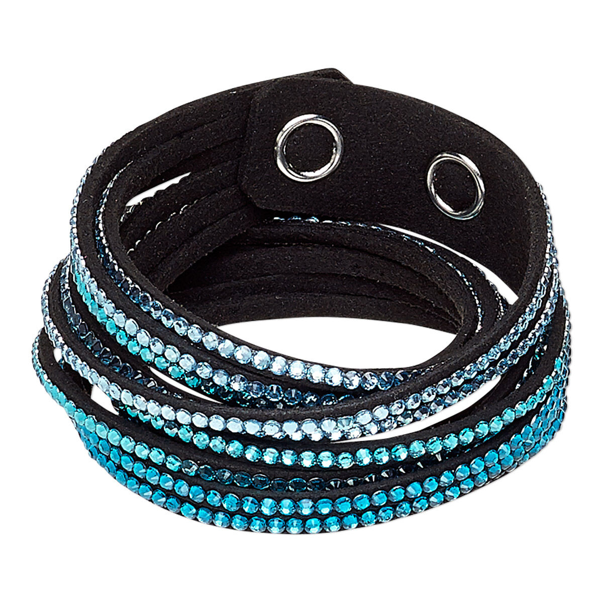 Bracelet, 6-strand wrap, acrylic rhinestone / faux suede / imitation rhodium-plated brass, black / clear / multi-blue, 19mm wide, adjustable at 6-1/2 and 7 inches with snap closure. Sold individually.