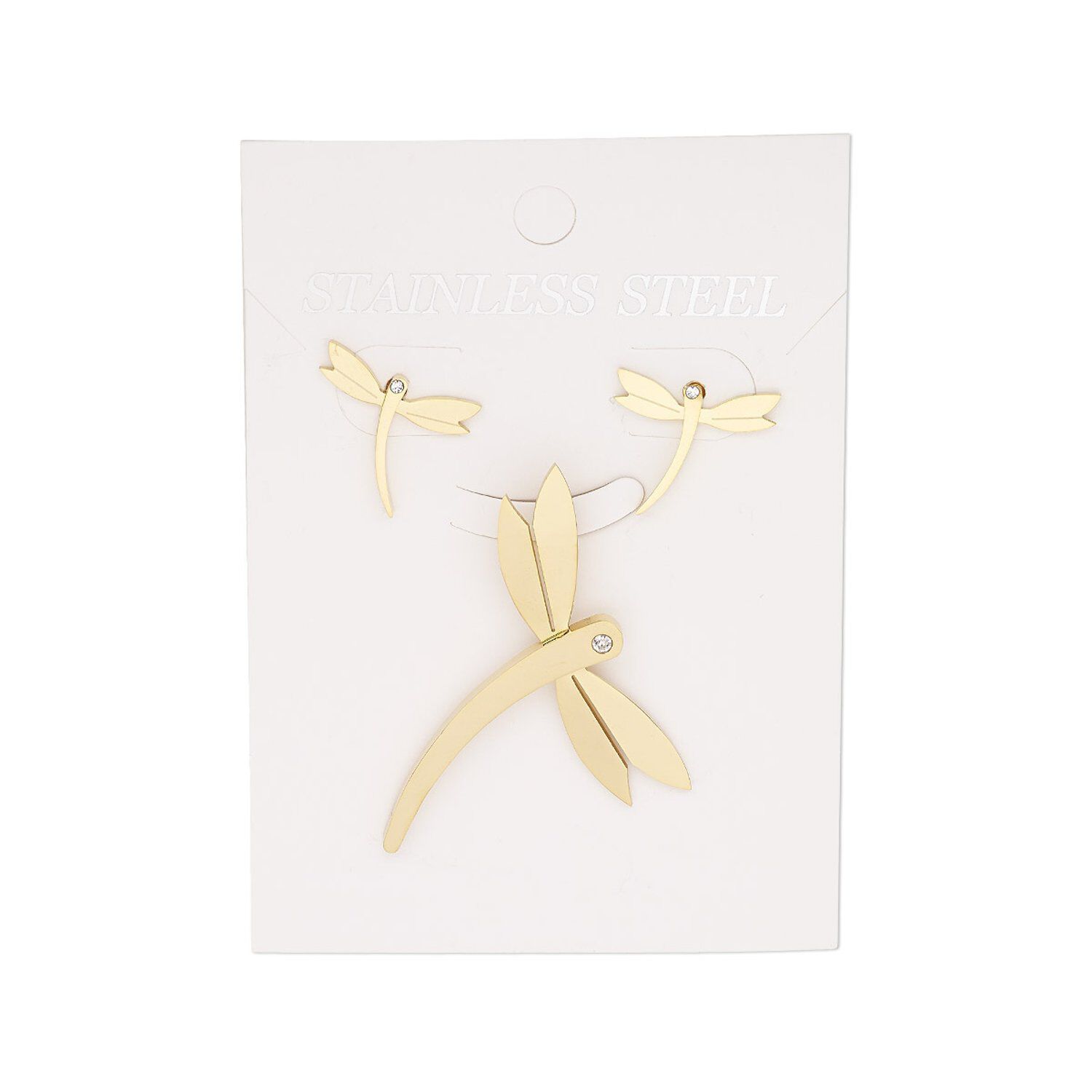 Featuring a lustrous dragonfly design, stainless steel post earring and pendant set shimmers with a bright gold finish. Ready-to-wear set is a great addition to jewelry lines that will display well and sell with ease. Colors, shapes and sizes may vary in each lot.