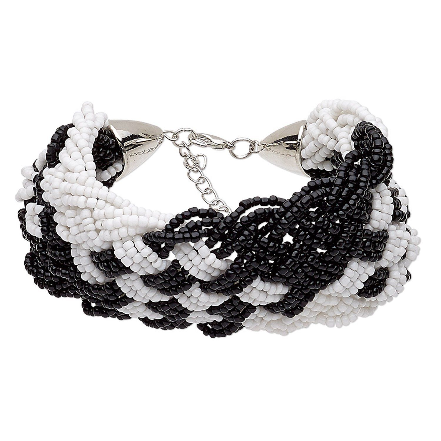 Bracelet, glass / silver-coated plastic / silver-finished steel / "pewter" (zinc-based alloy), black and white, 50mm wide with woven design, 6-1/2 inches with 2-inch extender chain and lobster claw clasp. Sold individually.