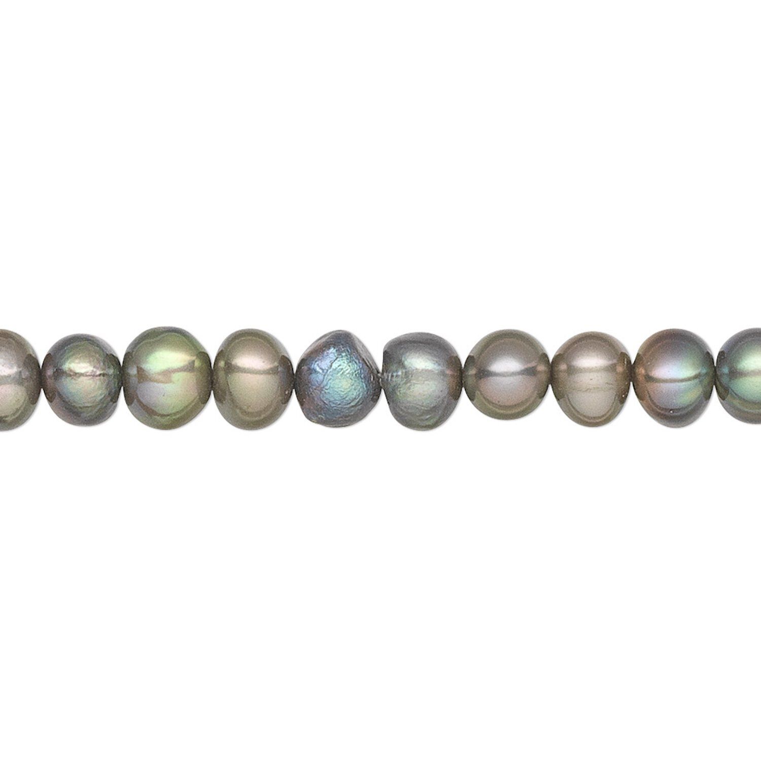 Pearl, cultured freshwater (dyed), gunmetal green, 5-6mm semi-round, C grade, Mohs hardness 2-1/2 to 4. Sold per 15-inch strand.