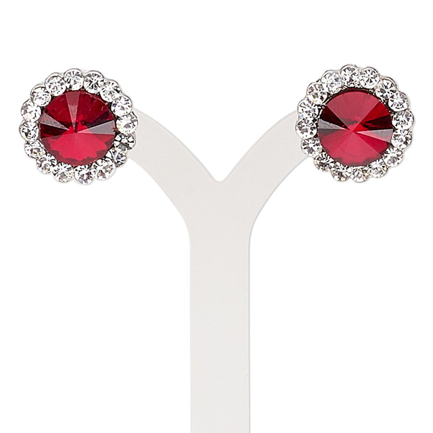 Earring, glass / glass rhinestone / stainless steel / silver-plated "pewter" (zinc-based alloy), red and clear, 15mm round with post. Sold per pair.