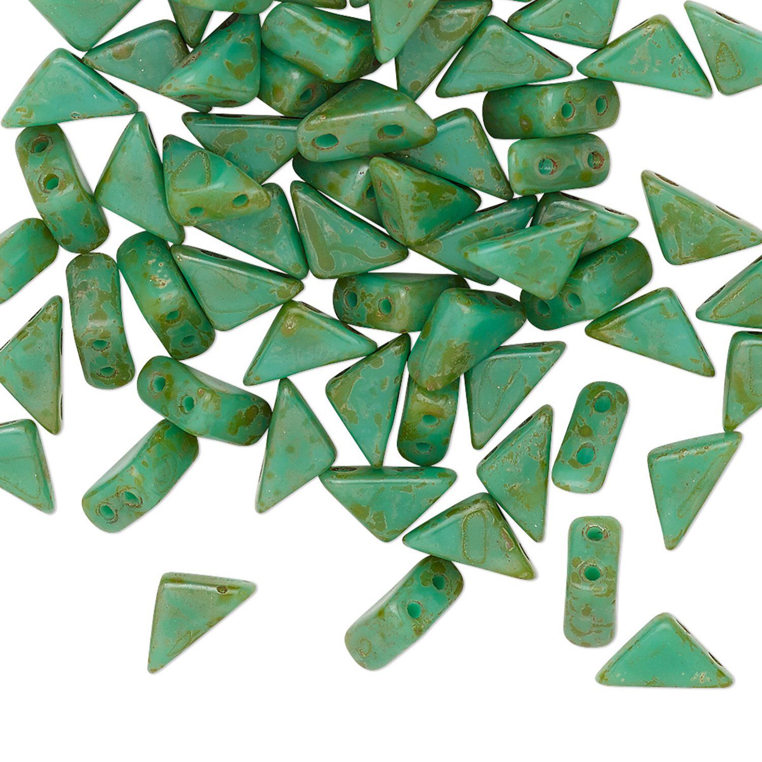 Bead, Tango™, Czech pressed glass, opaque Picasso green turquoise, 8x6x6mm triangle with (2) 0.7-0.8mm holes. Sold per 10-gram pkg, approximately 65 beads.