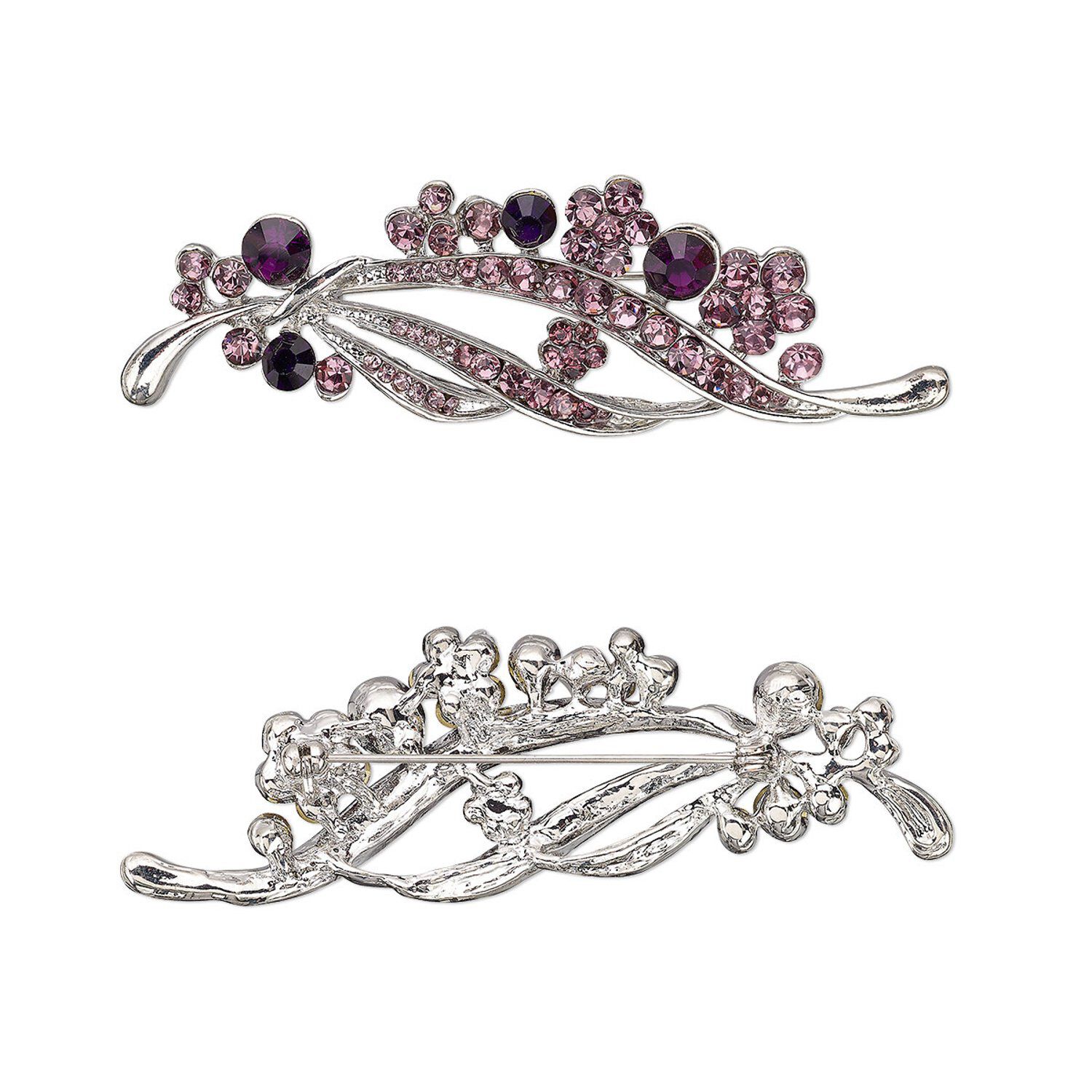 Brooch, glass rhinestone and imitation rhodium-plated "pewter" (zinc-based alloy), dark purple and light purple, 3x1-inch flower. Sold individually.
