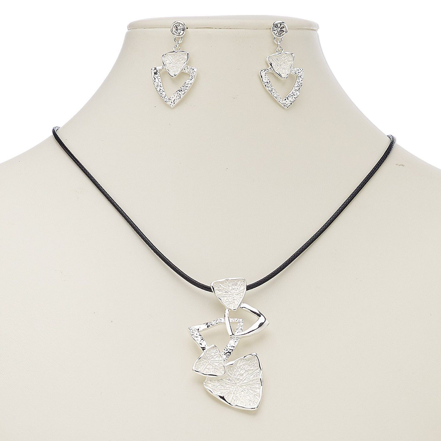 Necklace and earring set, enamel / waxed cotton cord / glass rhinestone / silver-plated steel / "pewter" (zinc-based alloy), black and white, 56x32mm triangles, 18-inch necklace with 2-inch extender chain and lobster claw clasp, 35mm earrings with post. Sold per set.