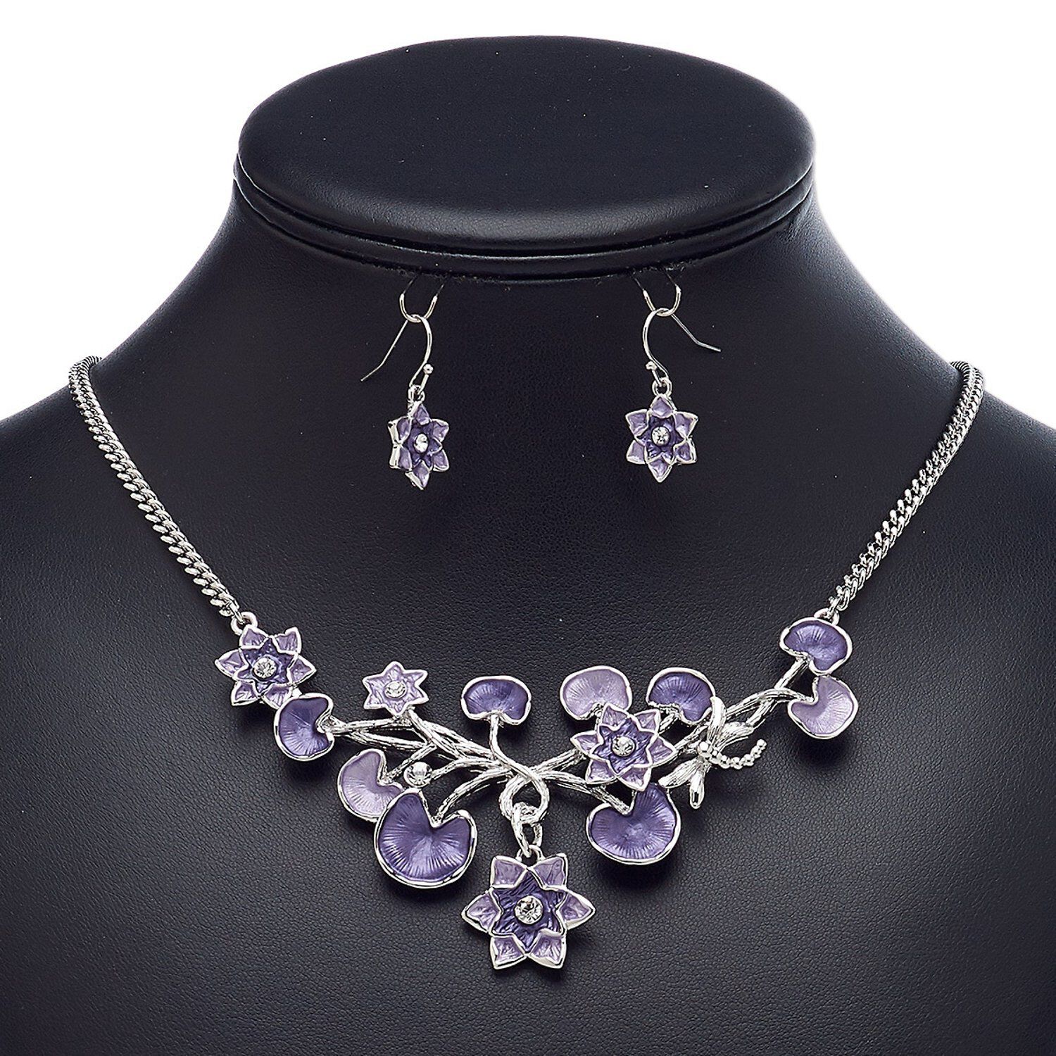 Necklace and earring set, enamel / glass rhinestone / imitation rhodium-plated brass / steel / "pewter" (zinc-based alloy), purple / lavender / clear, lotus, 18-inch necklace with 2-inch extender chain and lobster claw clasp, 26mm earrings with fishhook ear wire. Sold per set.