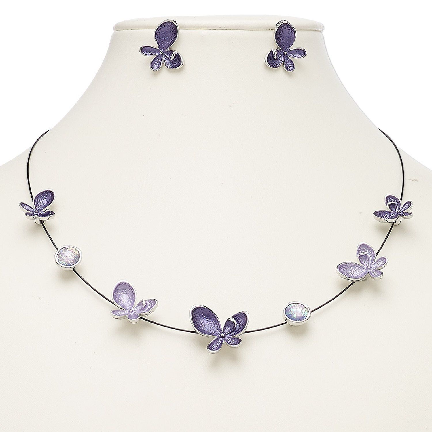 Necklace and earring set, enamel / resin / stainless steel / imitation rhodium-plated steel / "pewter" (zinc-based alloy), matte and opalescent black / lavender / white, butterfly, 18-inch necklace with 2-inch extender chain and lobster claw clasp, 19x18mm butterfly with post. Sold per set.