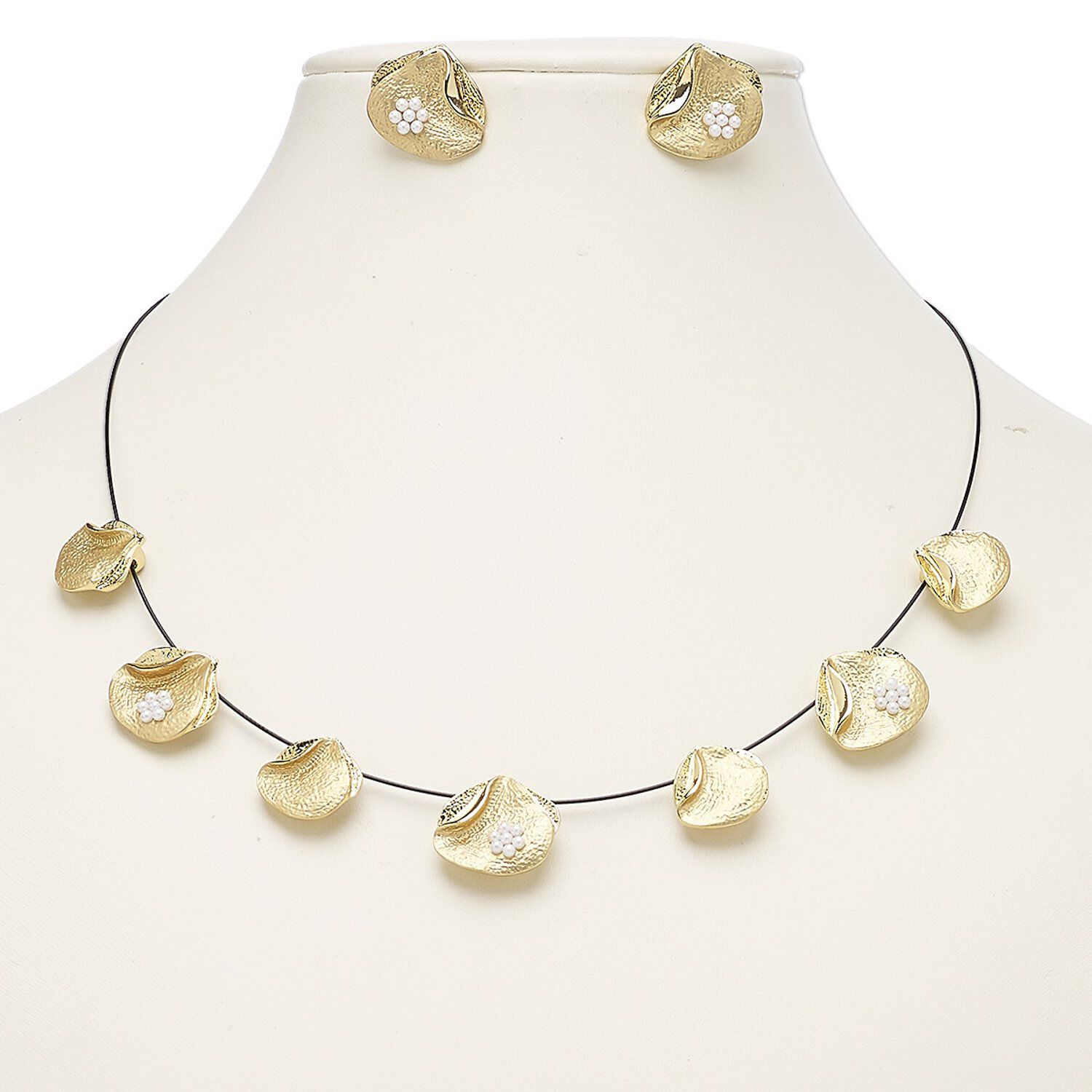 Necklace and earring set, plastic pearl / stainless steel / gold-finished steel / "pewter" (zinc-based alloy), black and white, freeform with flower, 18-inch necklace with 2-inch extender chain and lobster claw clasp, 18x17mm freeform with post. Sold per set.