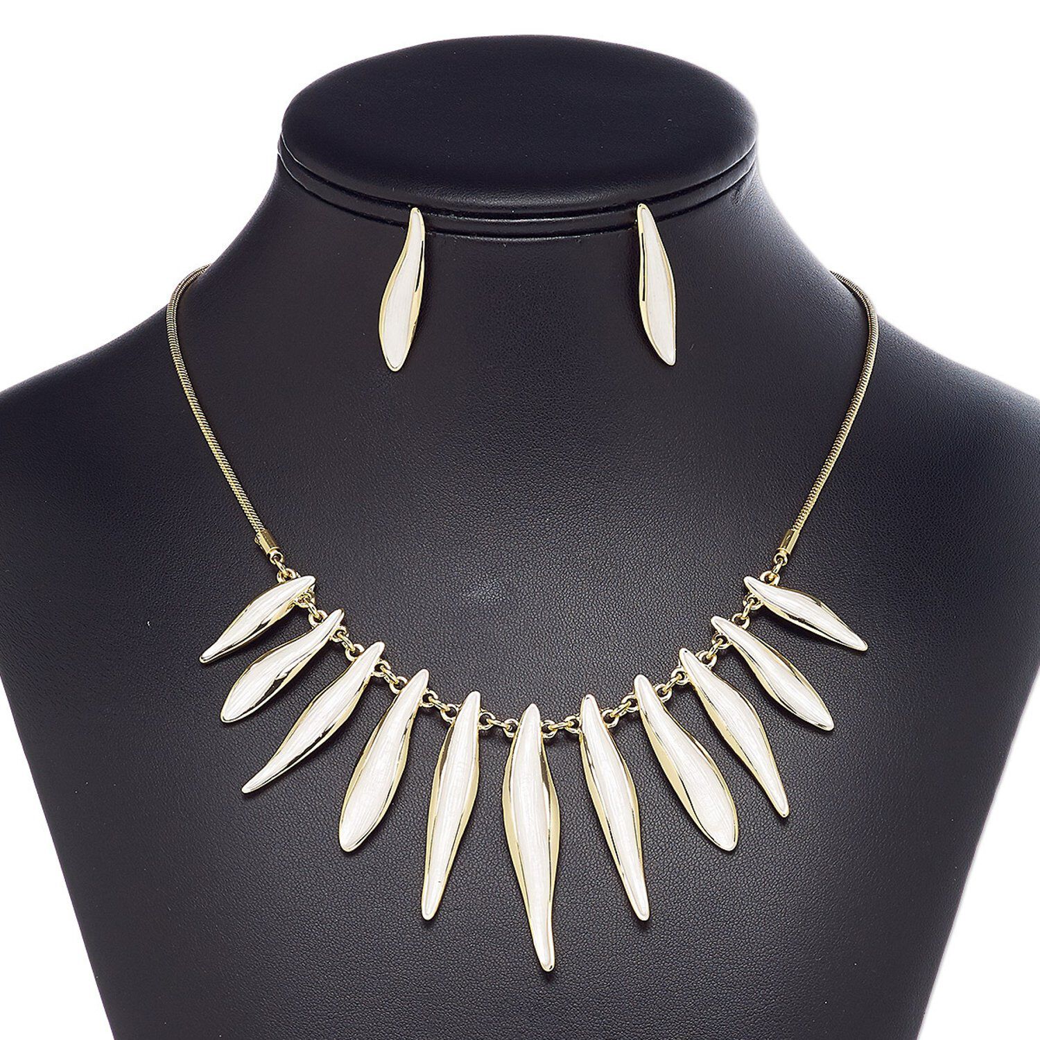 Necklace and earring set, enamel / gold-finished steel / brass / "pewter" (zinc-based alloy), white, 26x7mm-52x10mm graduated freeform stick, 18-inch necklace with 2-inch extender chain and lobster claw clasp, 31mm earrings with post. Sold per set.