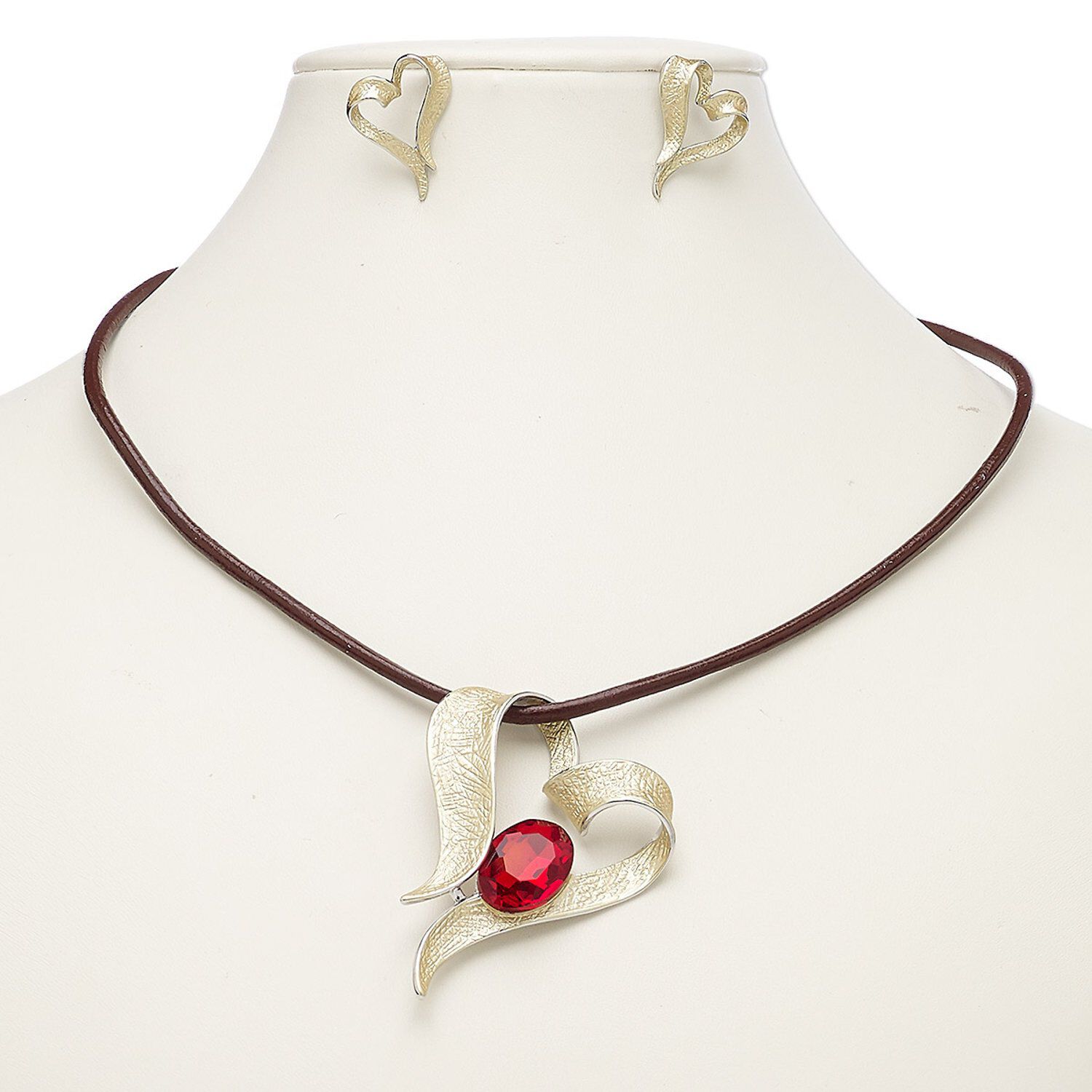 Necklace and earring set, leather (dyed) / enamel / glass / imitation rhodium-plated steel / brass / "pewter" (zinc-based alloy), brown / matte gold / red, 59x43mm heart, 18-inch necklace with 2-inch extender chain and lobster claw clasp, 23.5x17mm heart with post. Sold per set.