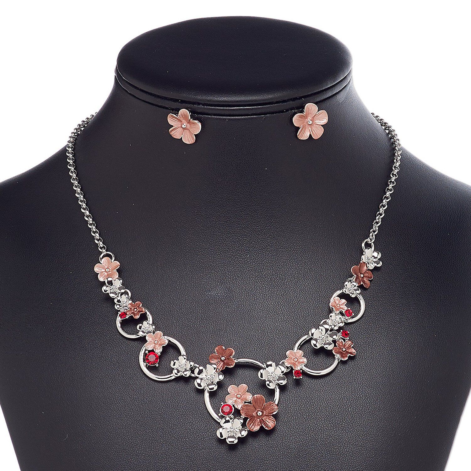 Necklace and earring set, enamel / glass rhinestone / imitation rhodium-finished steel / brass / "pewter" (zinc-based alloy), red / pink / dark pink, flower, 18-inch necklace with 2-inch extender chain and lobster claw clasp, 14mm flower with post. Sold per set.