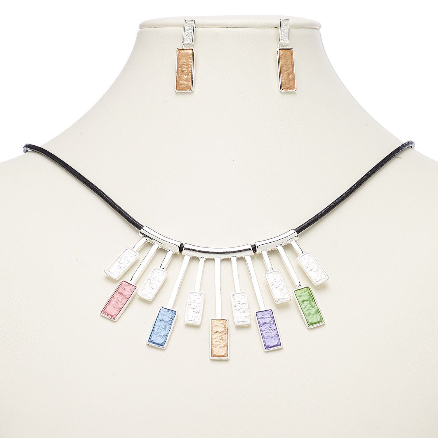Necklace and earring set, leather (dyed) / enamel / imitation rhodium-plated steel / brass / "pewter" (zinc-based alloy), multicolored, geometric fan, 18-inch necklace with 2-inch extender chain and lobster claw clasp, 31.5mm earrings with post. Sold per set.