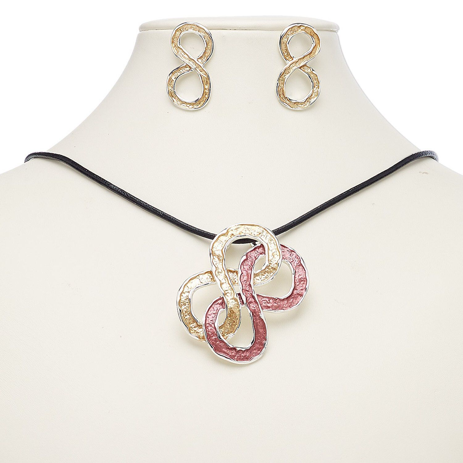 Necklace and earring set, leather (dyed) / enamel / imitation rhodium-plated steel / brass / "pewter" (zinc-based alloy), black / orange / pink, 57x49mm knot, 18-inch necklace with 2-inch extender chain and lobster claw clasp, 34mm earrings with post. Sold per set.