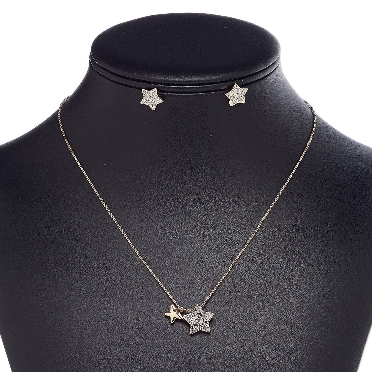 Necklace and earring set, glass rhinestone / rose gold finish steel / brass / "pewter" (zinc-based alloy), clear, 9x9mm and 14x14mm star, 18-inch necklace with 2-inch extender chain and lobster claw clasp, 12x12mm star earrings with post. Sold per set.