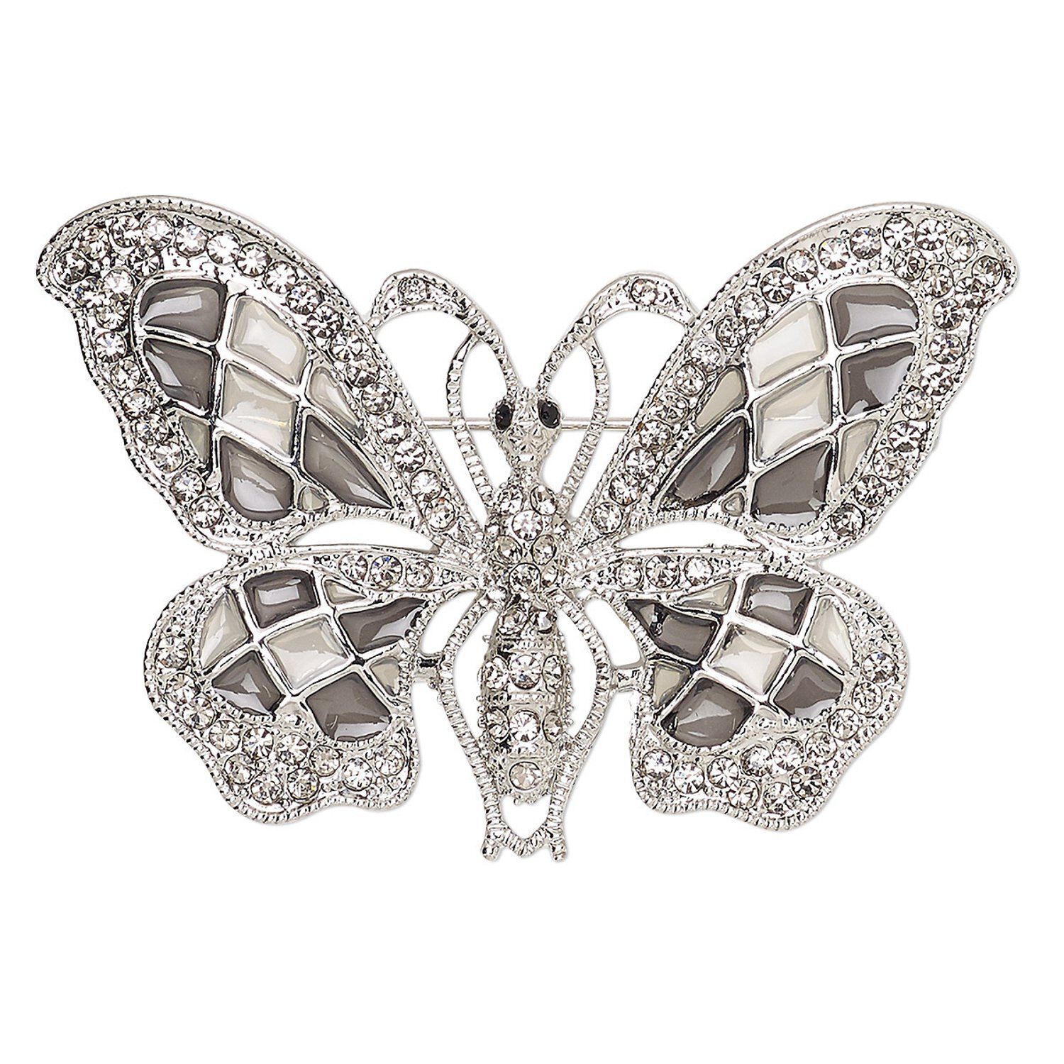 Brooch, glass rhinestone / enamel / imitation rhodium-finished "pewter" (zinc-based alloy), grey and clear, 58x35mm butterfly. Sold individually.