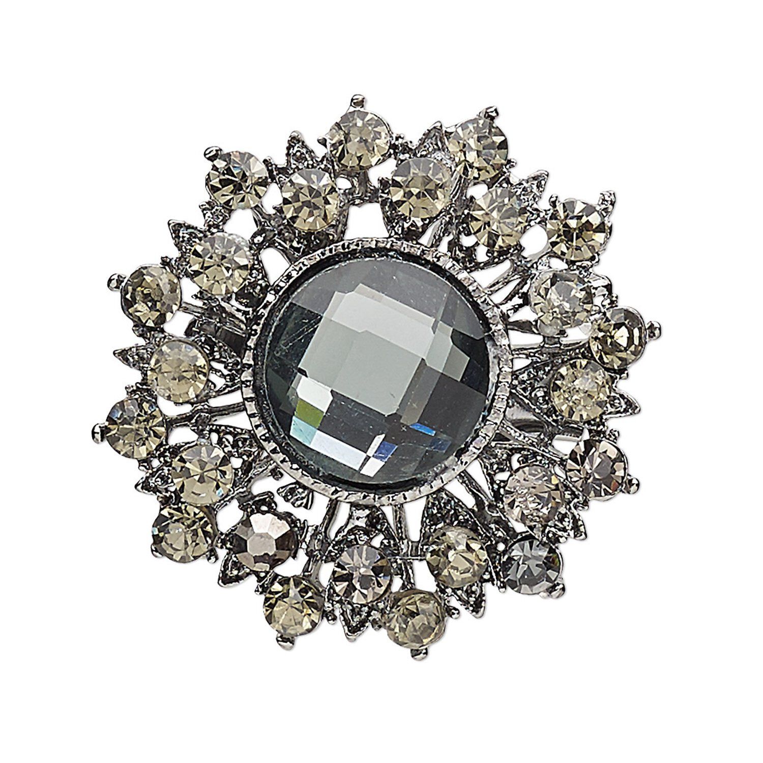 Brooch, glass rhinestone with antique silver-plated brass and "pewter" (zinc-based alloy), smoky brown and grey, 36mm fancy round. Sold individually.