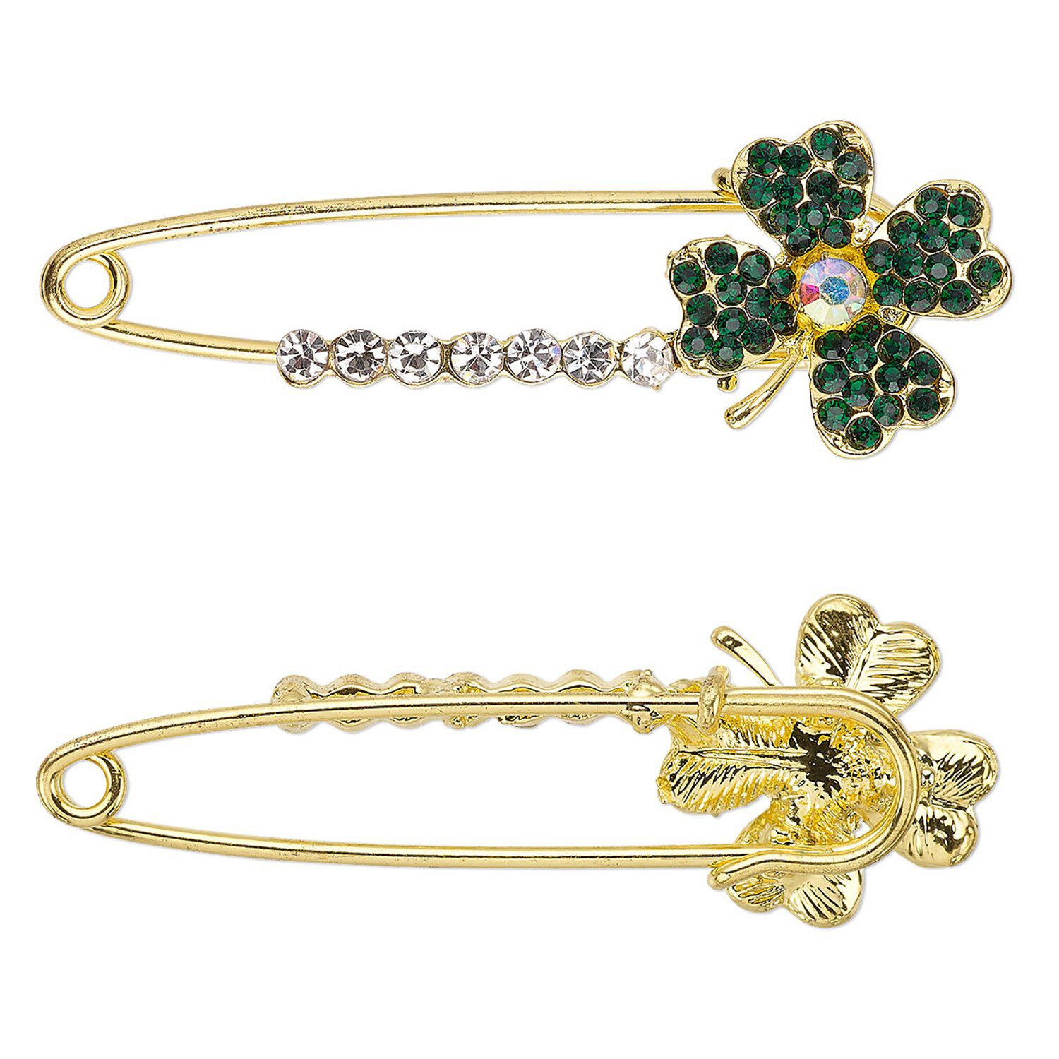 Brooch, glass rhinestone with gold-finished steel and "pewter" (zinc-based alloy), emerald green, emerald green / clear / clear AB, 58x20mm safety pin with 20x20mm clover. Sold individually.