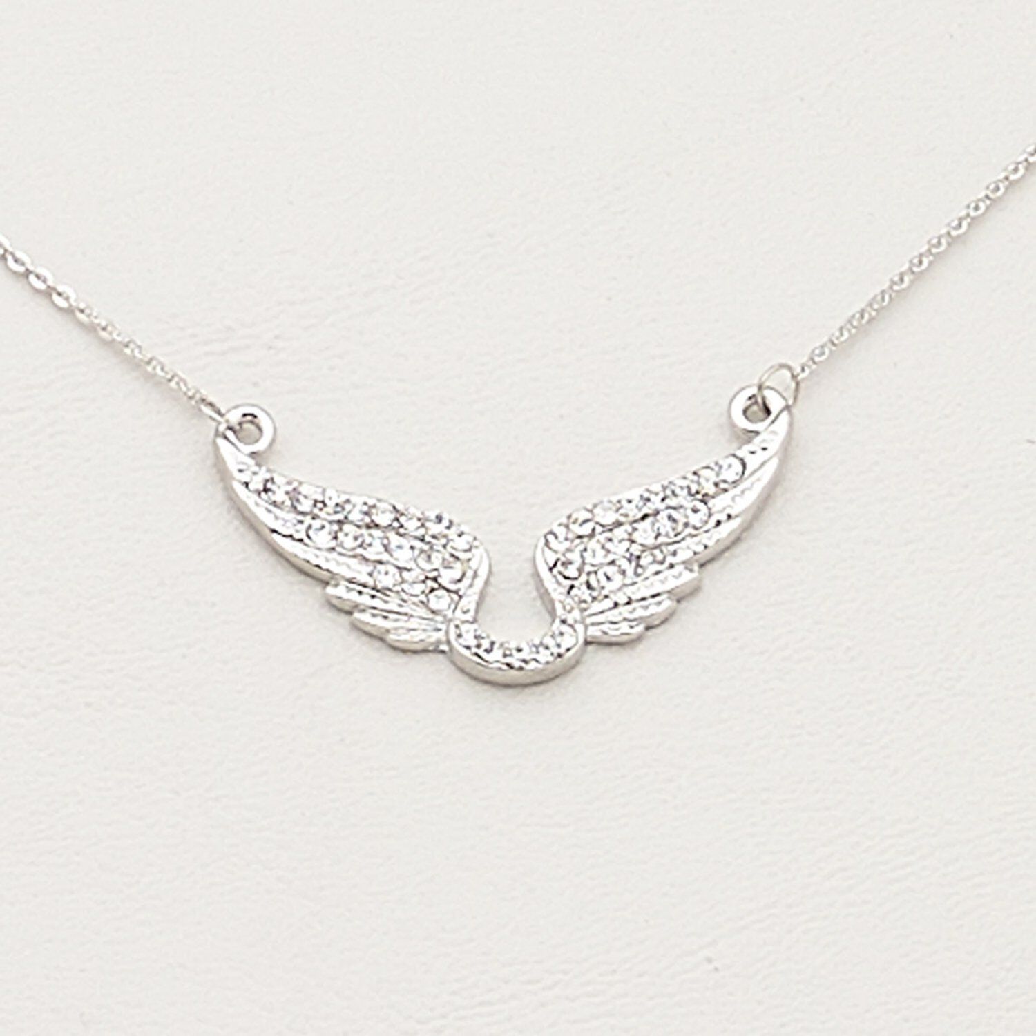Necklace, Czech glass rhinestone / imitation rhodium-finished steel / brass / "pewter" (zinc-based alloy), clear, 36x16mm wings, 18 inches with 2-inch extender chain and lobster claw clasp. Sold individually.