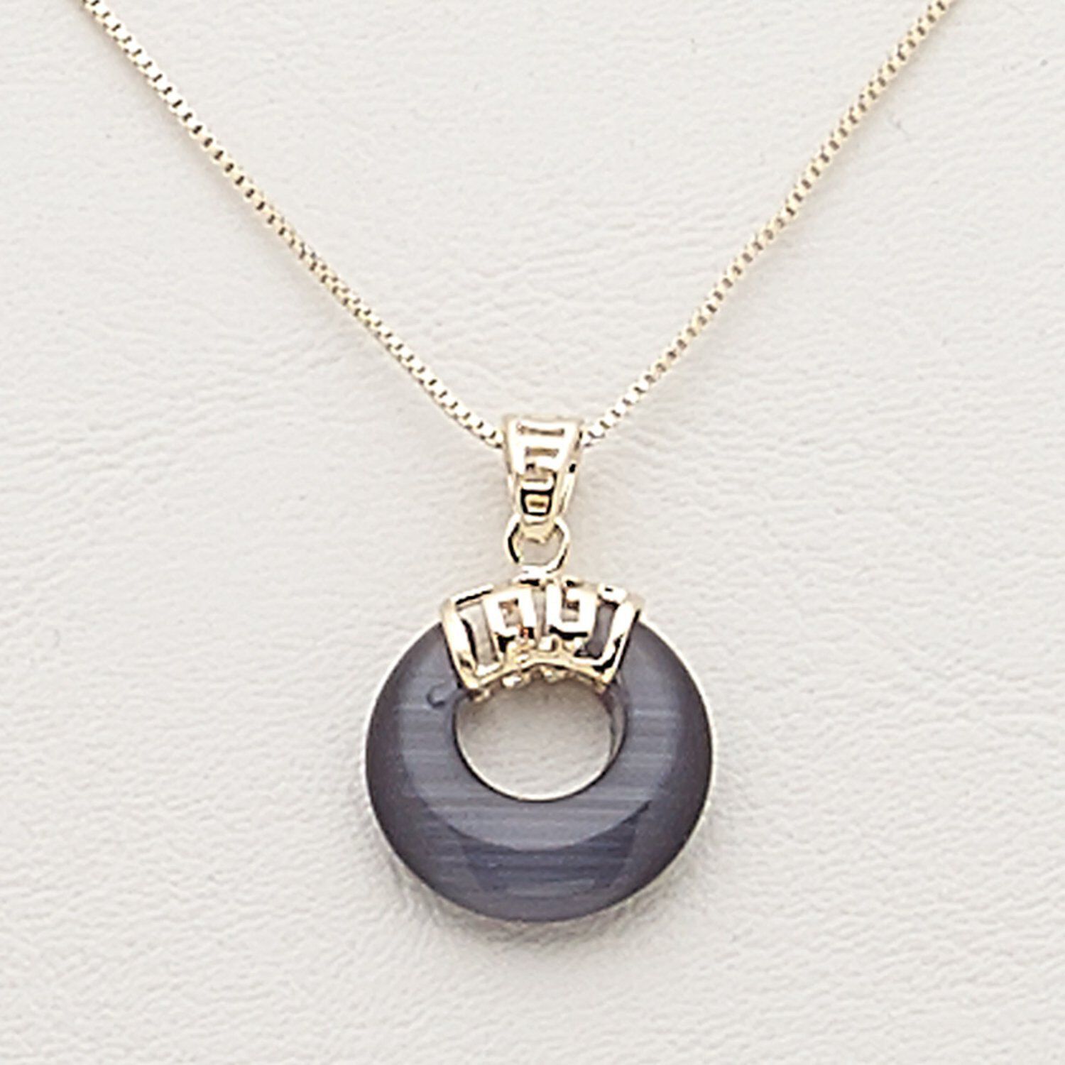 Necklace, cat's eye glass / gold-finished steel / brass / "pewter" (zinc-based alloy), black, 18mm round donut, 17 inches with 2-inch extender chain and lobster claw clasp. Sold individually.