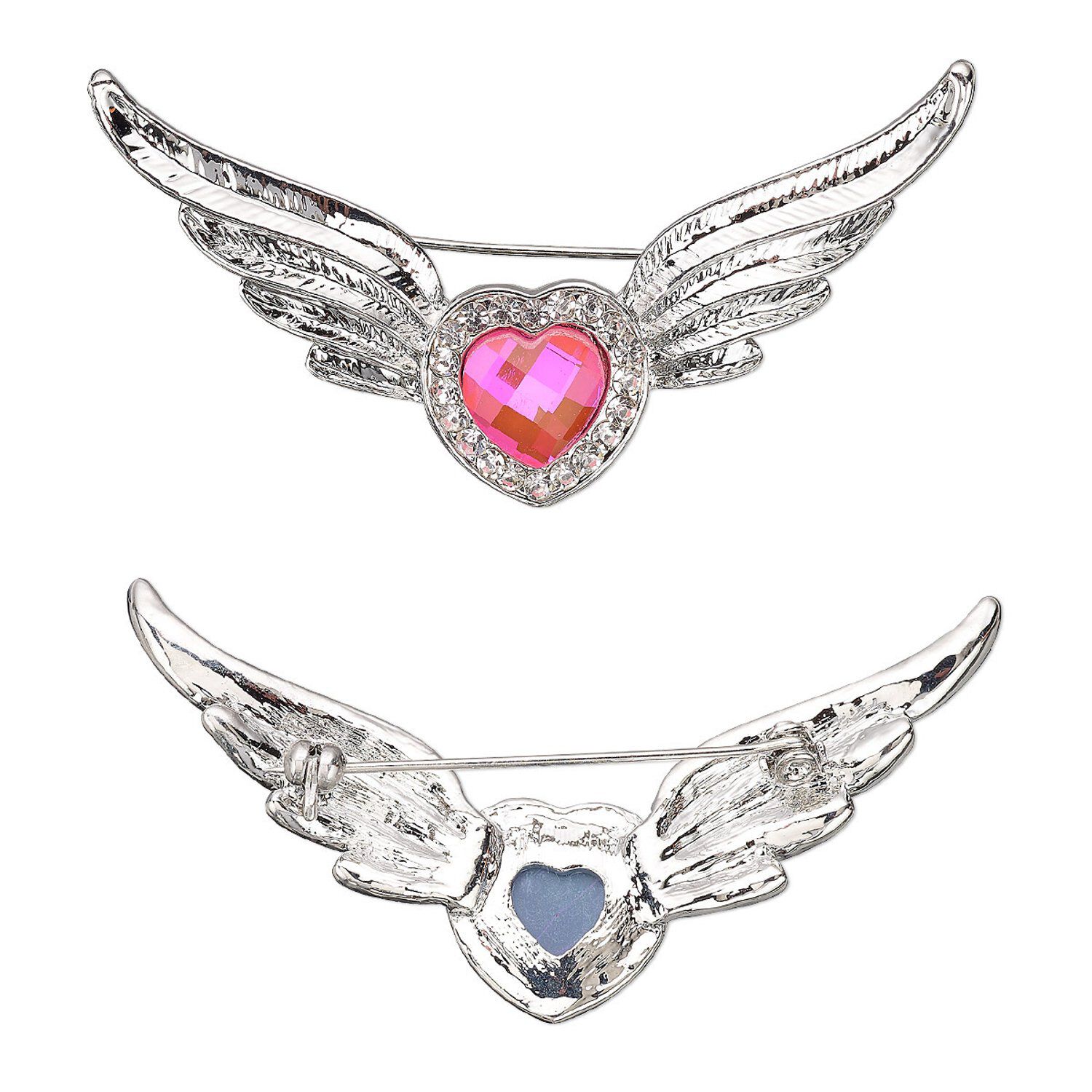 "Pewter" (zinc-based alloy) winged heart brooch features crisp details due to a quality casting process, accented with sparkling glass rhinestones. Colors, shapes and sizes may vary in each lot.