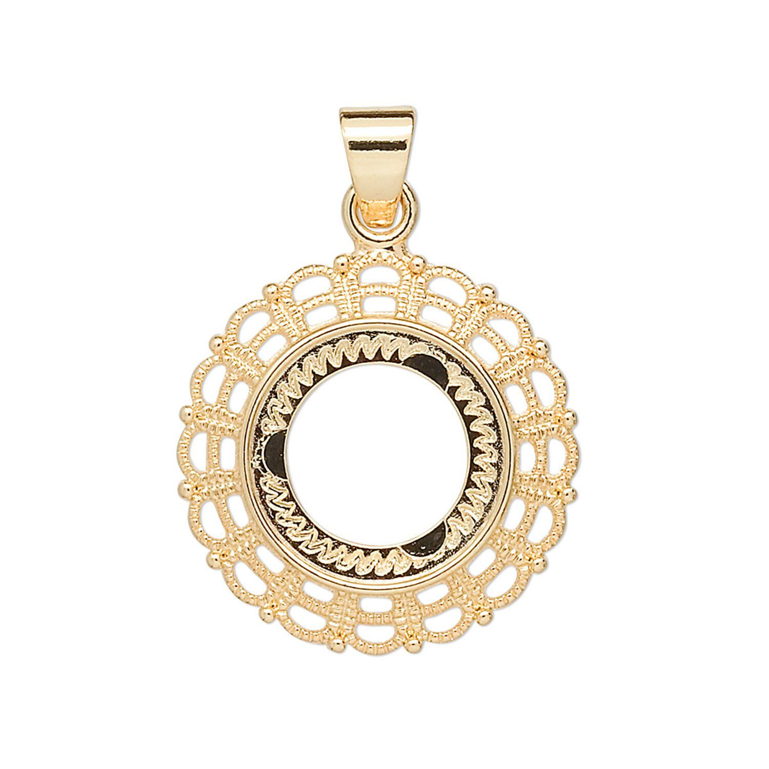 Pendant, gold-plated "pewter" (zinc-based alloy), 23mm fancy round with 14mm round setting. Sold per pkg of 4.