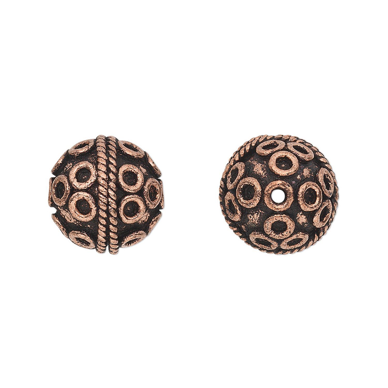 Bead, antique copper-plated copper, 13mm round with rope and circle pattern. Sold per pkg of 6.