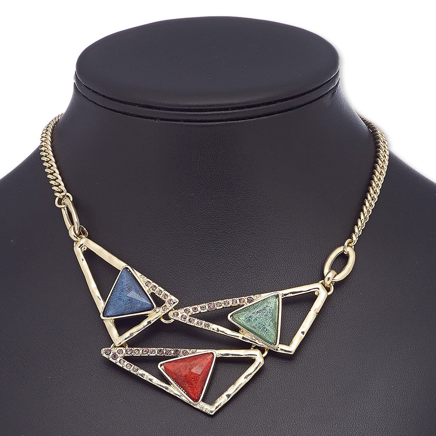 Ready-to-wear jewelry is great for counter sales or giving as a gift. Gold-finished steel and "pewter" (zinc-based alloy) necklace features multicolored resin triangles and glass rhinestones.