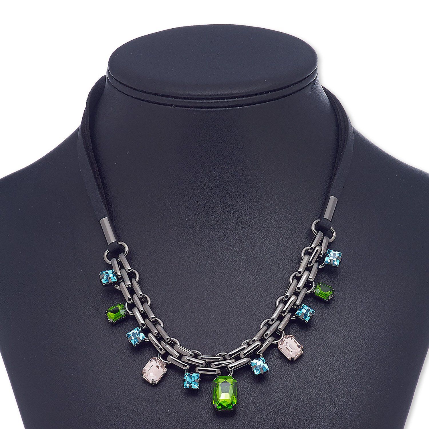 Ready-to-wear jewelry is great for counter sales or giving as a gift. Black leather necklace features multicolored glass stones, black-plated steel and "pewter."
