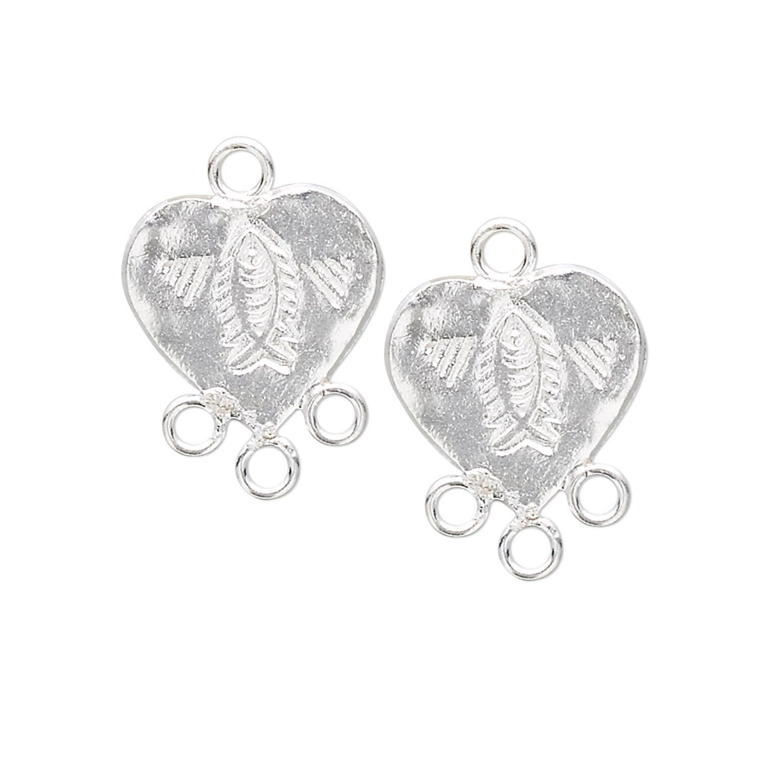 Drop, sterling silver, 21x15mm heart with fish, 3 loops. Sold per pkg of 2.