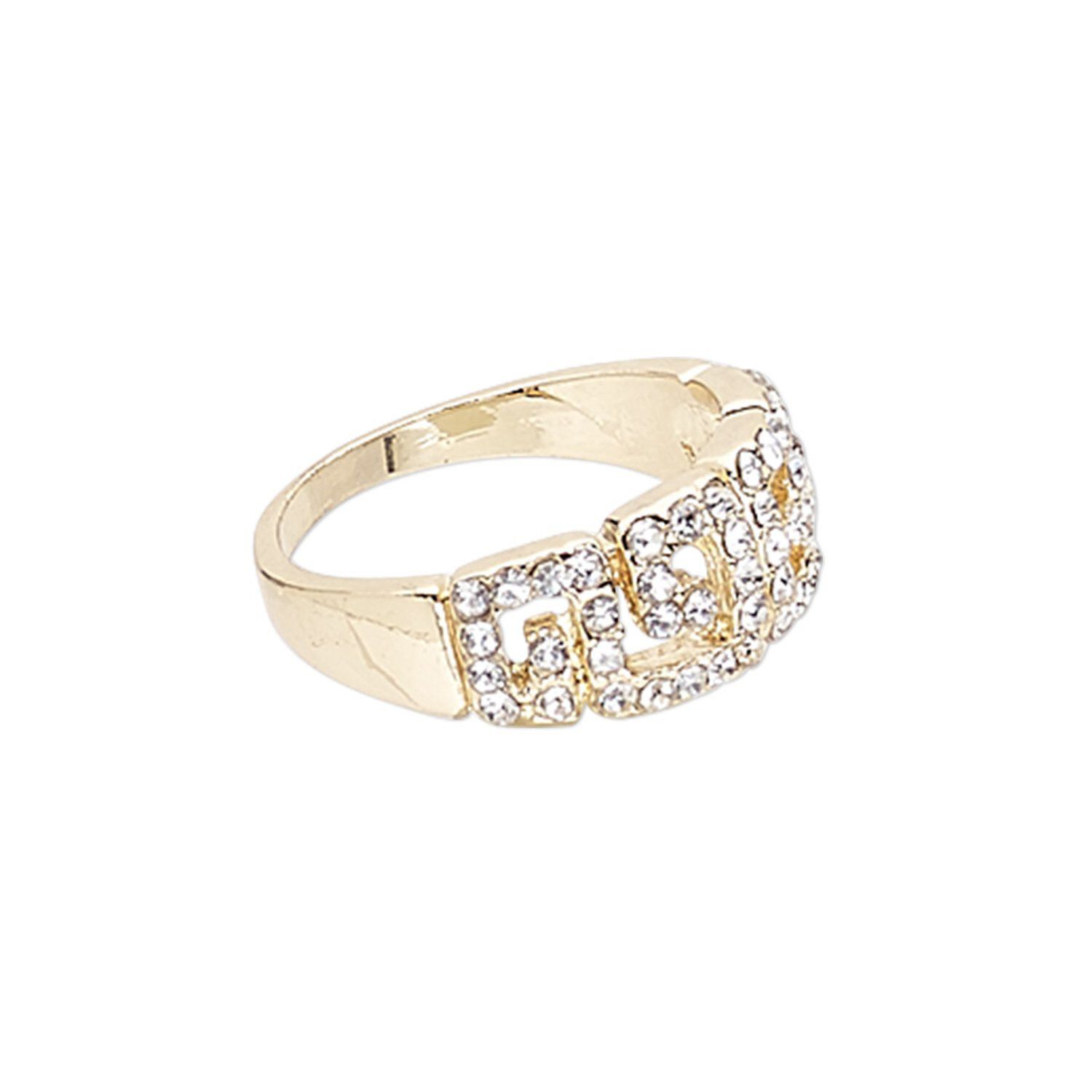 Ring, Egyptian glass rhinestone and gold-finished "pewter" (zinc-based alloy), clear, 9mm wide with Greek key design, size 8. Sold individually.