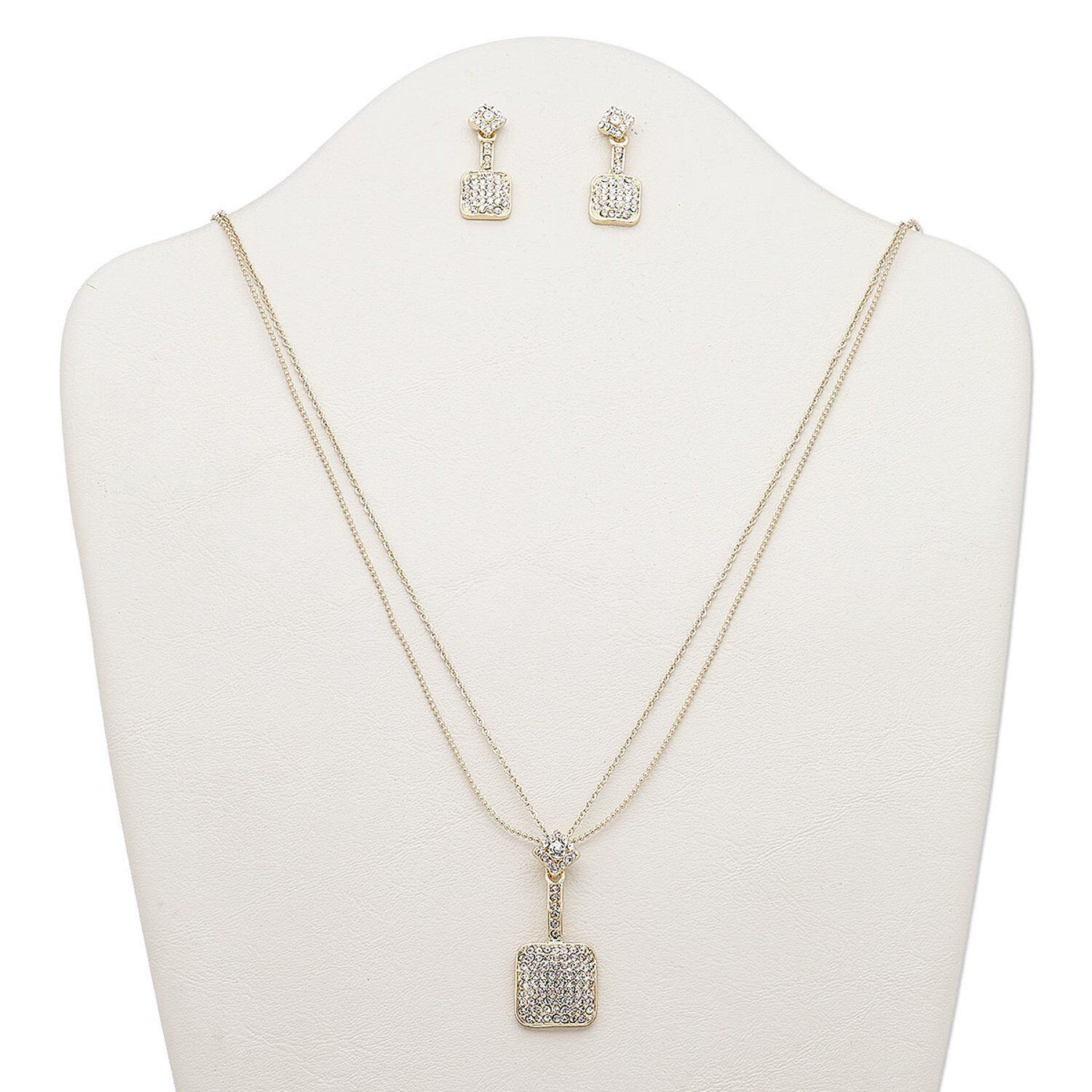 Necklace and earring set, 2-strand, Egyptian glass rhinestone / gold-finished steel / brass / "pewter" (zinc-based alloy), clear, 45x20mm with square, 32-inch necklace with 2-inch extender chain and lobster claw clasp, 30mm earrings with post. Sold per set.