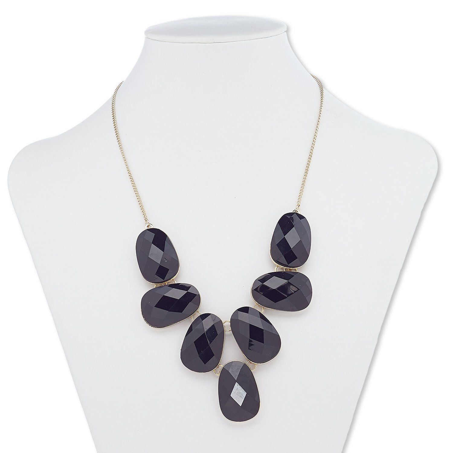 Necklace, acrylic with gold-finished steel and "pewter" (zinc-based alloy), black, 31x20mm faceted teardrop, 18 inches with 2-inch extender chain and lobster claw clasp. Sold individually.