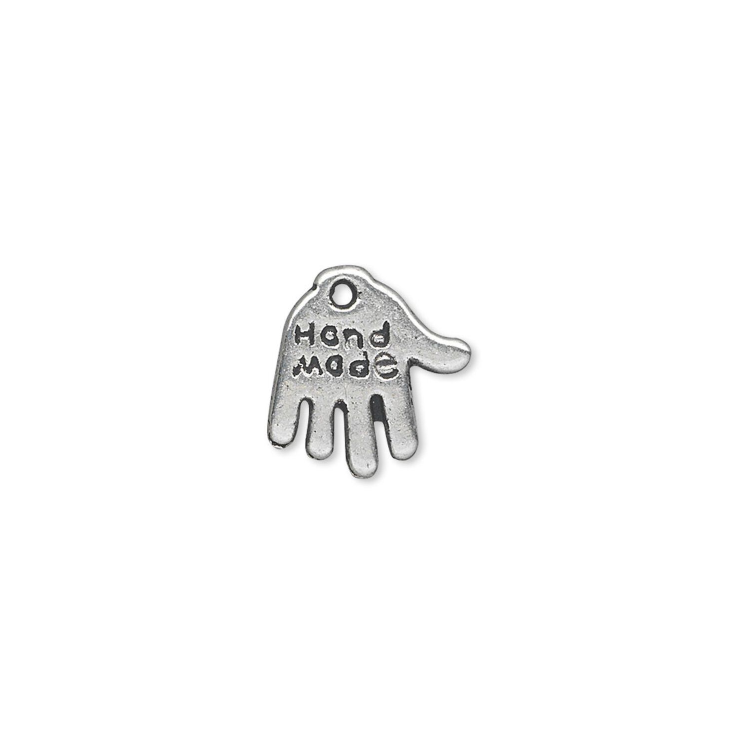 Charm, antique silver-plated "pewter" (zinc-based alloy), 13x11mm double-sided hand with "Hand Made" engraving. Sold per pkg of 50.