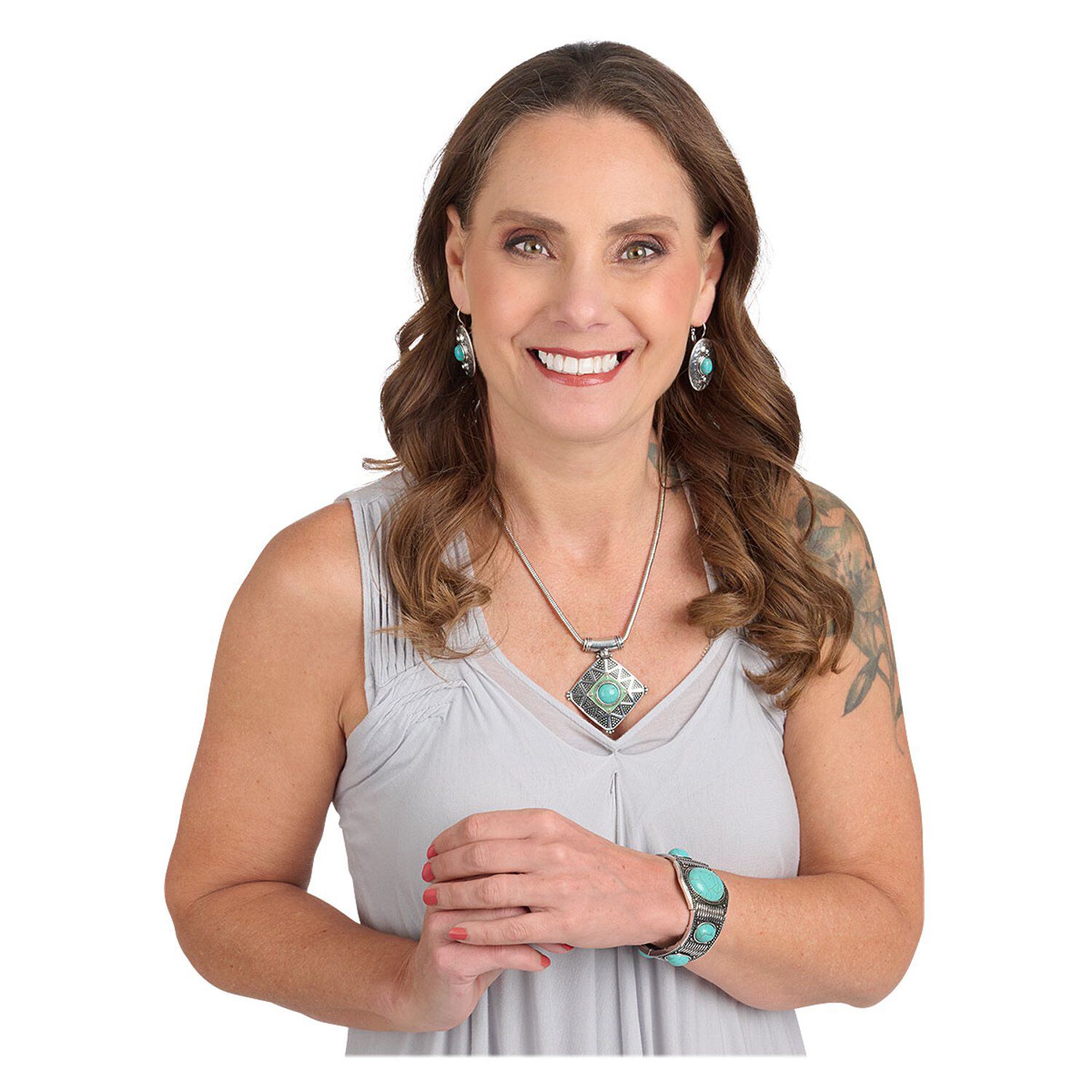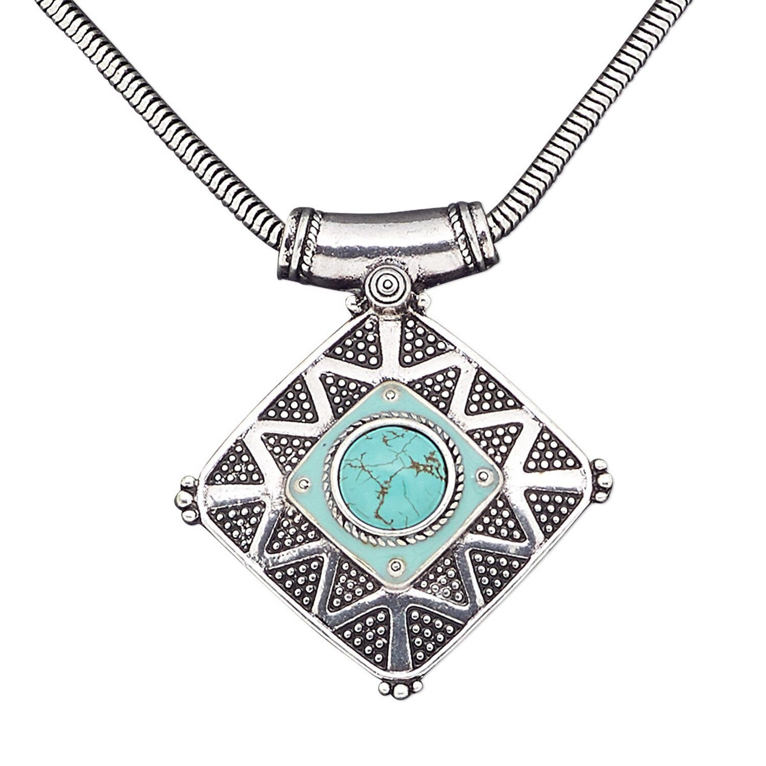Ready-to-wear jewelry is great for counter sales or as a gift. This antique silver-plated brass, steel and "pewter" necklace features a turquoise blue magnesite centerpiece inside of a diamond-shaped design. Colors, shapes and sizes may vary in each lot.
