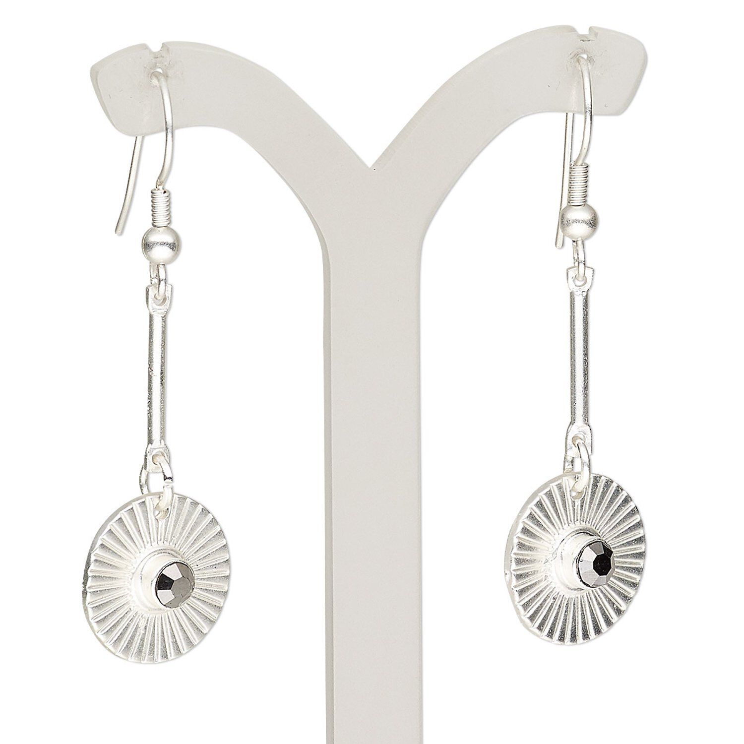 Earring, glass rhinestone with silver-plated brass and "pewter" (zinc-based alloy), black, 2 inches with matte flat round and fishhook ear wire. Sold per pair.