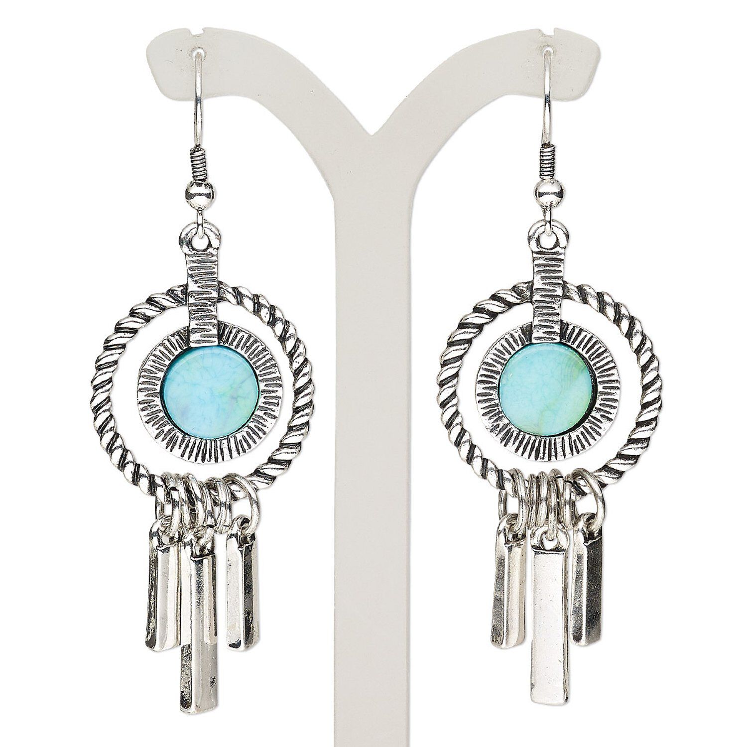 Great for a gift or for counter sales, these ready-to-wear earrings are antique silver-plated steel, brass and "pewter," and feature a turquoise blue rounds and dangles. Colors, shapes and sizes may vary in each lot. Earnuts included.