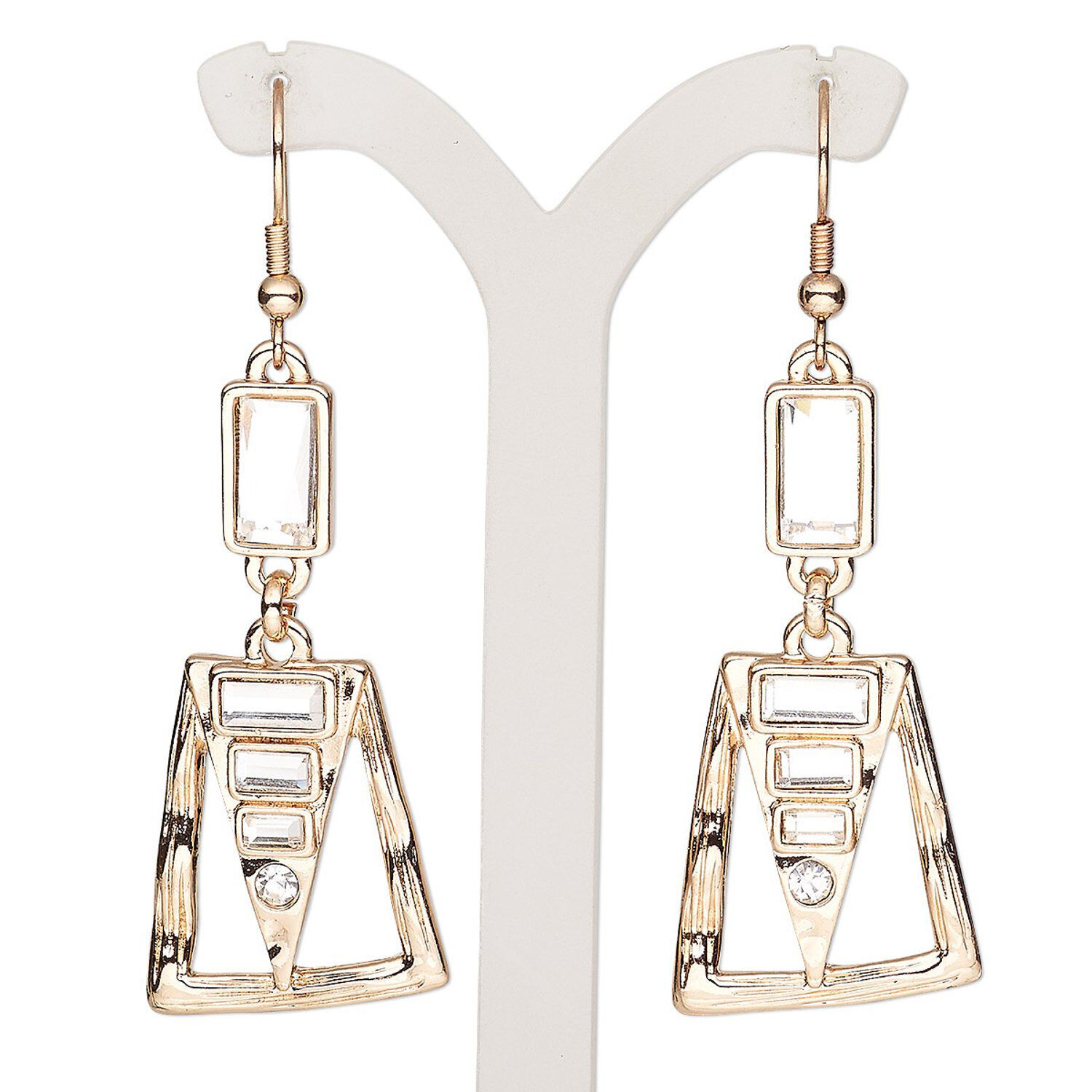 Earring, glass / glass rhinestone / rose gold-finished brass / steel / "pewter" (zinc-based alloy), clear, 2-1/2 inches with trapezoid and fishhook ear wire. Sold per pair.