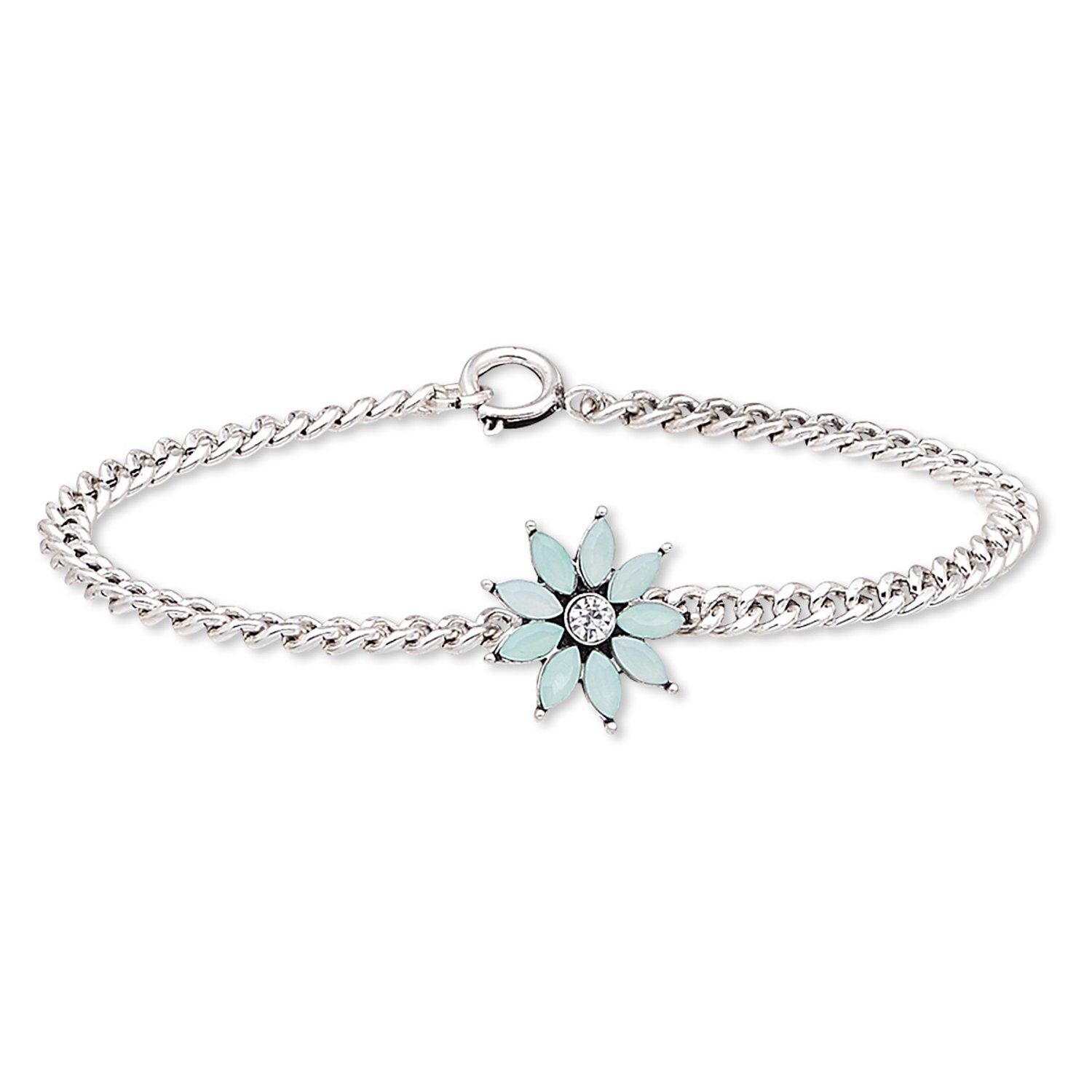 Bracelet, acrylic / glass rhinestone / silver-plated steel / "pewter" (zinc-based alloy), light blue and clear, 18x18mm flower, 7 inches with springring clasp. Sold individually.