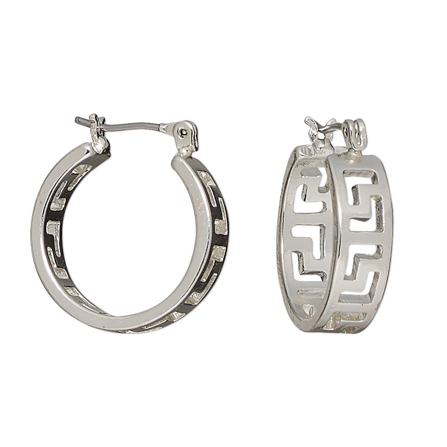 Earring, silver-plated steel and "pewter" (zinc-based alloy), 20mm round hoop with Greek key cutout design and latch-back closure. Sold per pair.