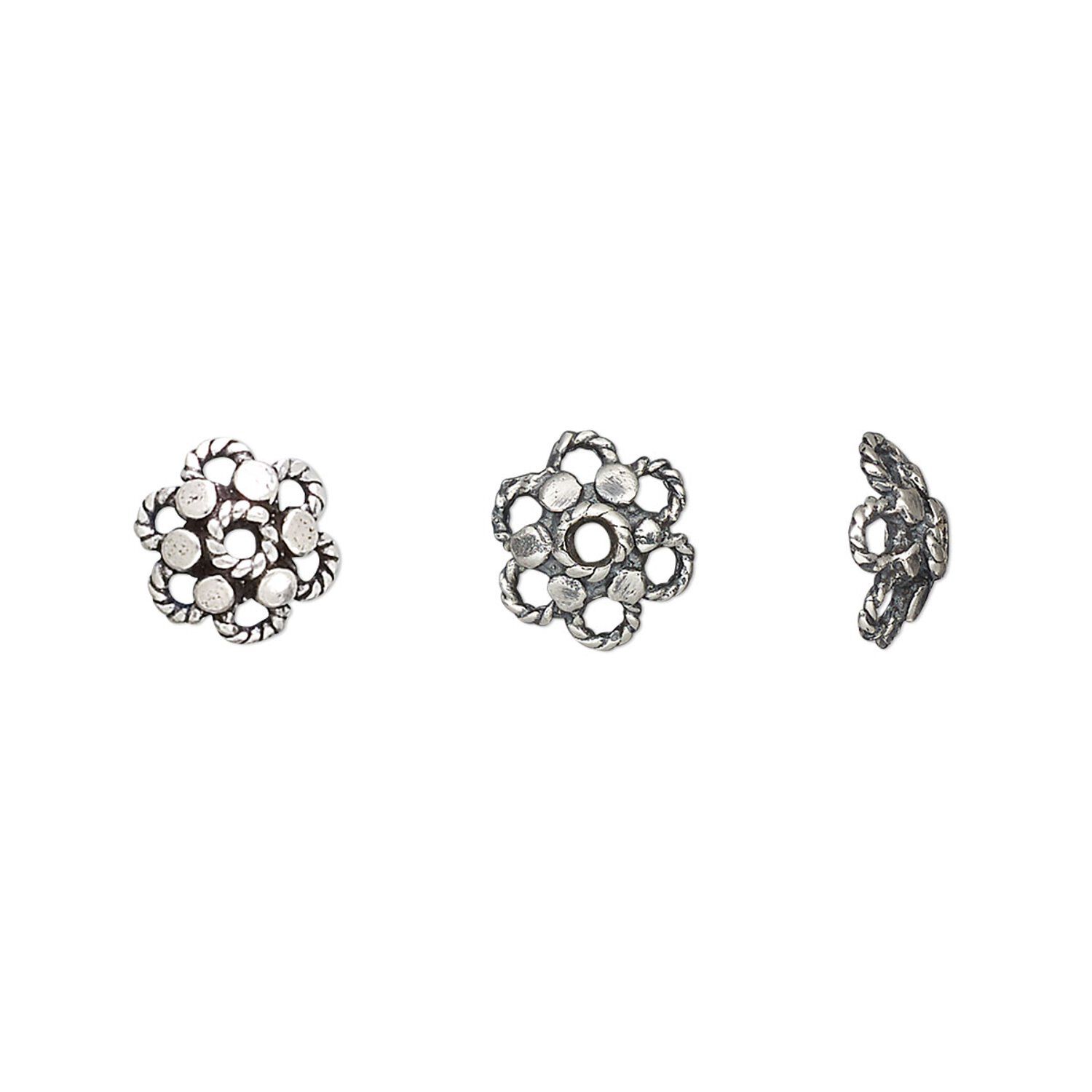 Bead cap, antiqued sterling silver, 8x3mm rope flower, fits 7-9mm bead. Sold per pkg of 2.