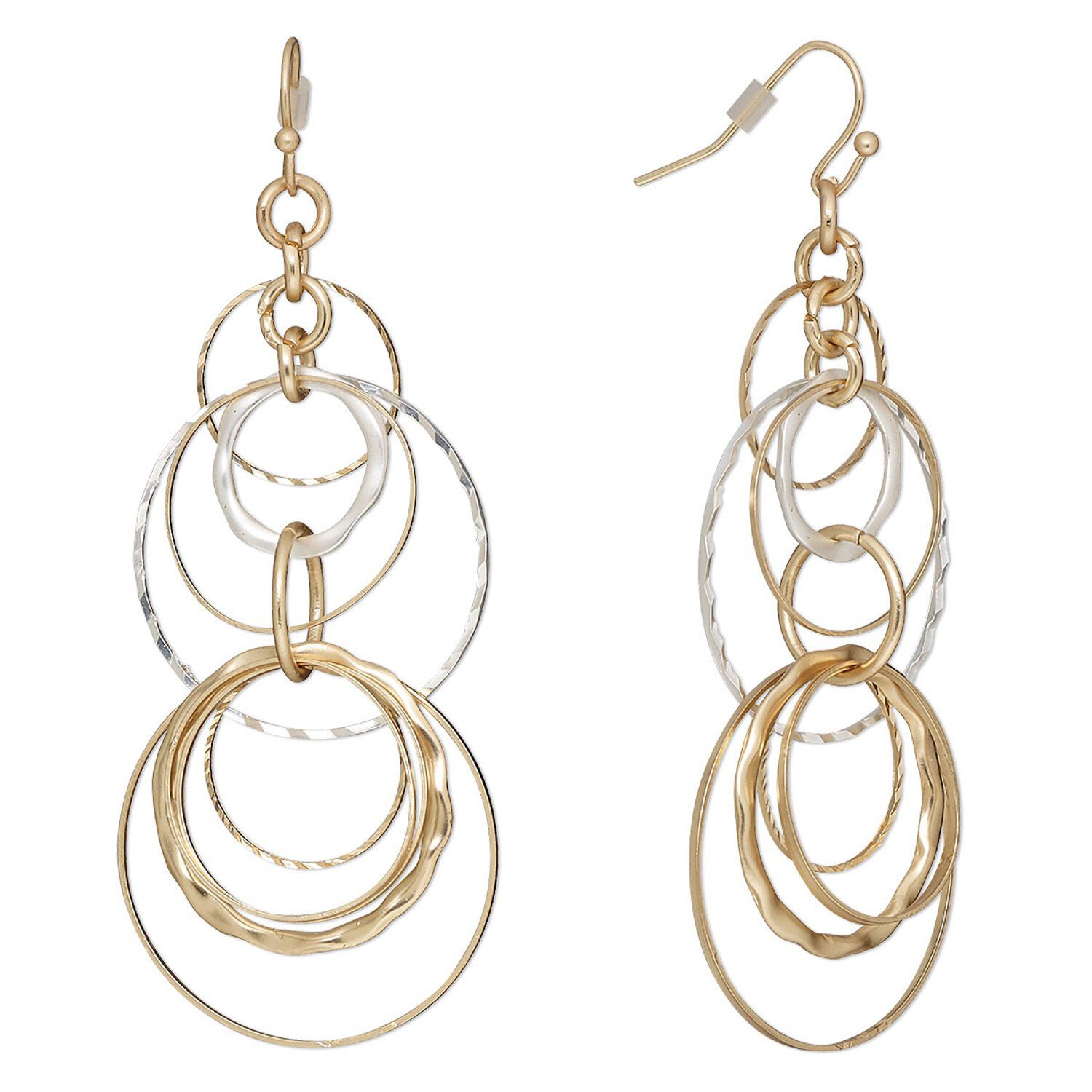 Multiple rings--showcasing a variety of finishes, platings and textures--dangle and swing in these multi-level earrings. Earnuts included.