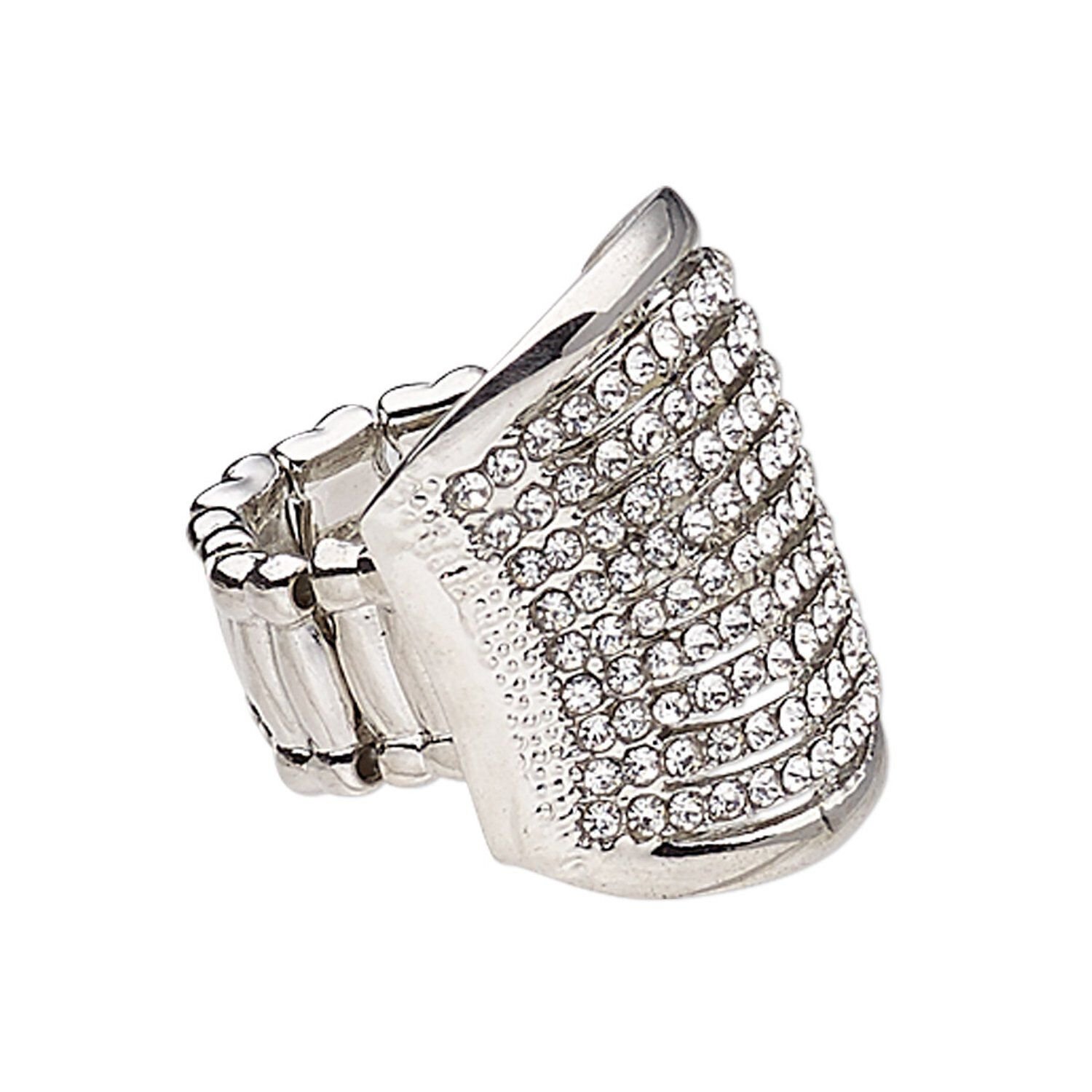 Ring, stretch, glass rhinestone / silver-coated plastic / silver-plated "pewter" (zinc-based alloy), clear, 26.5mm wide with rectangle, size 7-8. Sold individually.