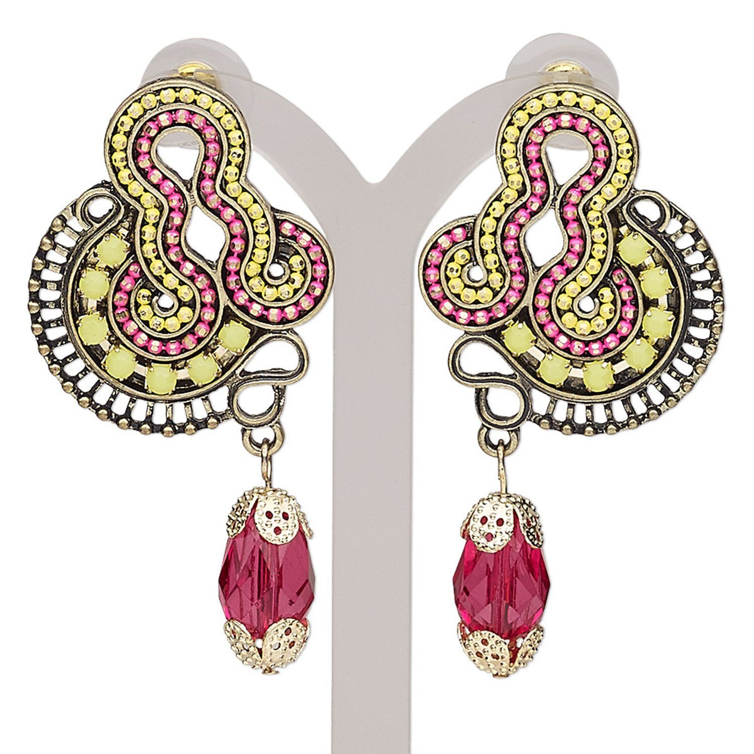 Earring, acrylic / acrylic rhinestone / enamel / stainless steel / antique gold-finished brass / steel / "pewter" (zinc-based alloy), multicolored, 2-1/3 inches with post. Sold per pair.
