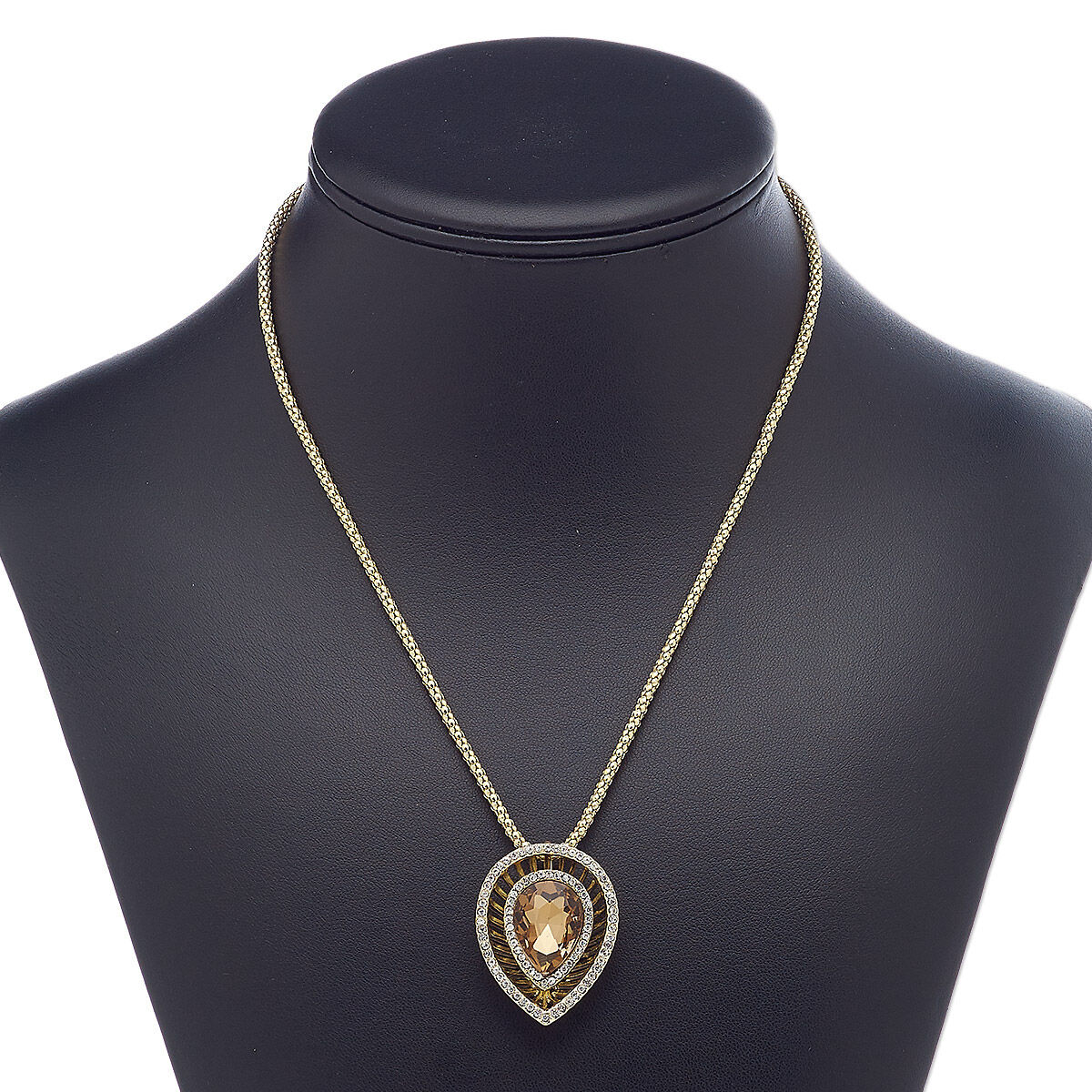Get the look of luxury without the hefty price tag. This stunning necklace showcases glittering clear glass rhinestones around a topaz brown, faceted glass centerpiece. The rich appearance of gold finish adds a high-contrast shine against the clear rhinestones.