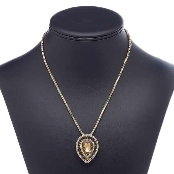 Necklace, glass rhinestone / glass / gold-finished steel / "pewter" (zinc-based alloy), topaz brown and clear, 35x27mm teardrop, 18 inches with 3-inch extender chain and lobster claw clasp. Sold individually.