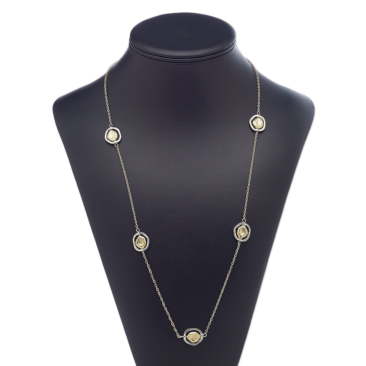 Gold finish and imitation rhodium plating give this stylishly long necklace a high-end appearance without the hefty price tag. Each open freeform oval and flat nugget is textured for heightened visual intrigue.