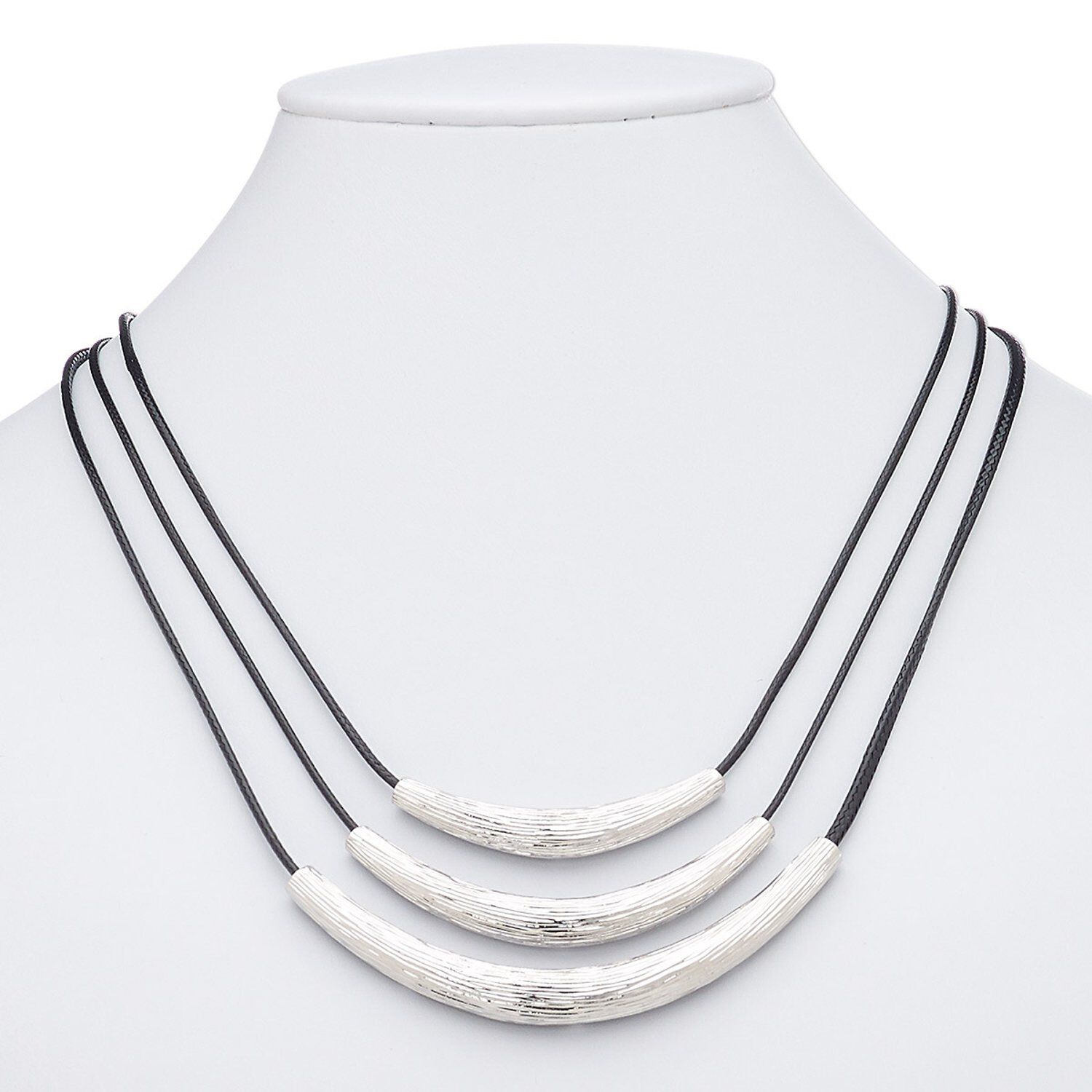 Necklace, 3-strand, waxed cotton cord with imitation rhodium-plated brass and "pewter" (zinc-based alloy), black, 2 x 1/4 to 3-1/4 x 1/4 inch graduated curved tube, 16 inches with 3-inch extender chain and lobster claw clasp. Sold individually.
