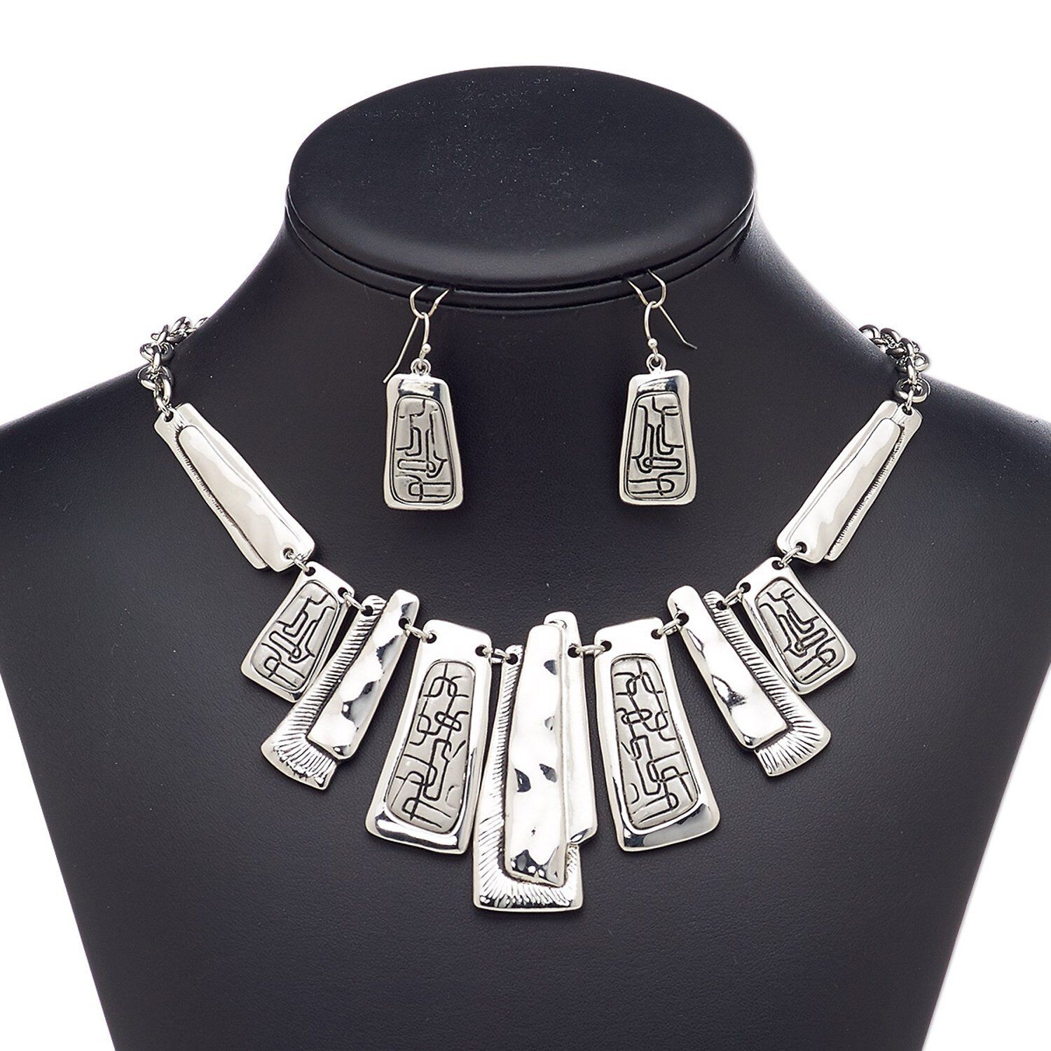 Geometric inspiration combines with a primitive fan design for this striking necklace and earring set. With gleaming antique silver plating and graduated trapezoids accented with line designs, this jewelry set is designed to sell.